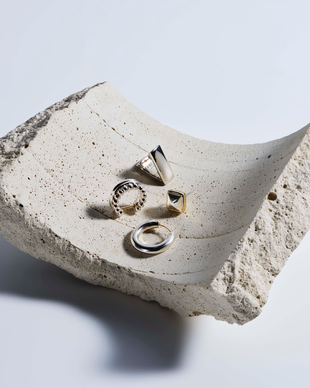 粒のディティールとモダンなラインが組み合わさったピアス。カジュアルな一面とモダンな印象を併せ持ちスタイリングにピリッとしたスパイスを効かせます。