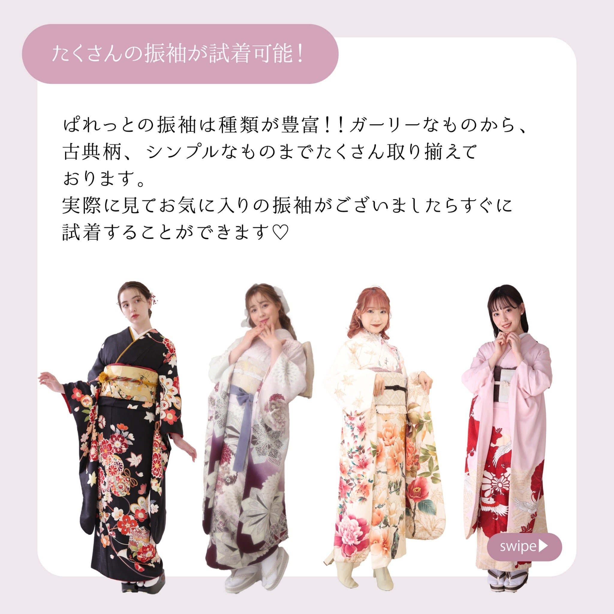 ①たくさんの振袖の中からお気に入りの振袖を試着可能