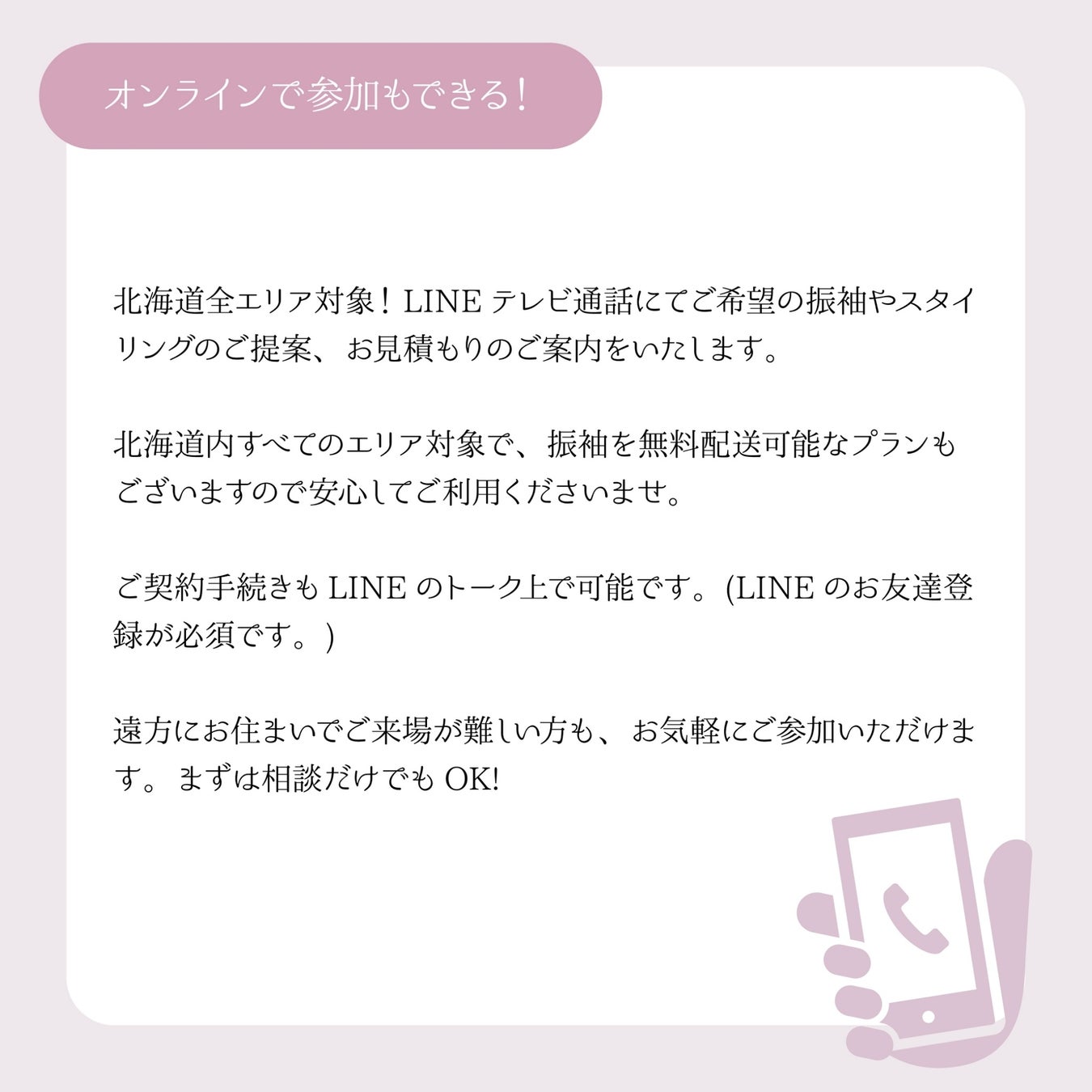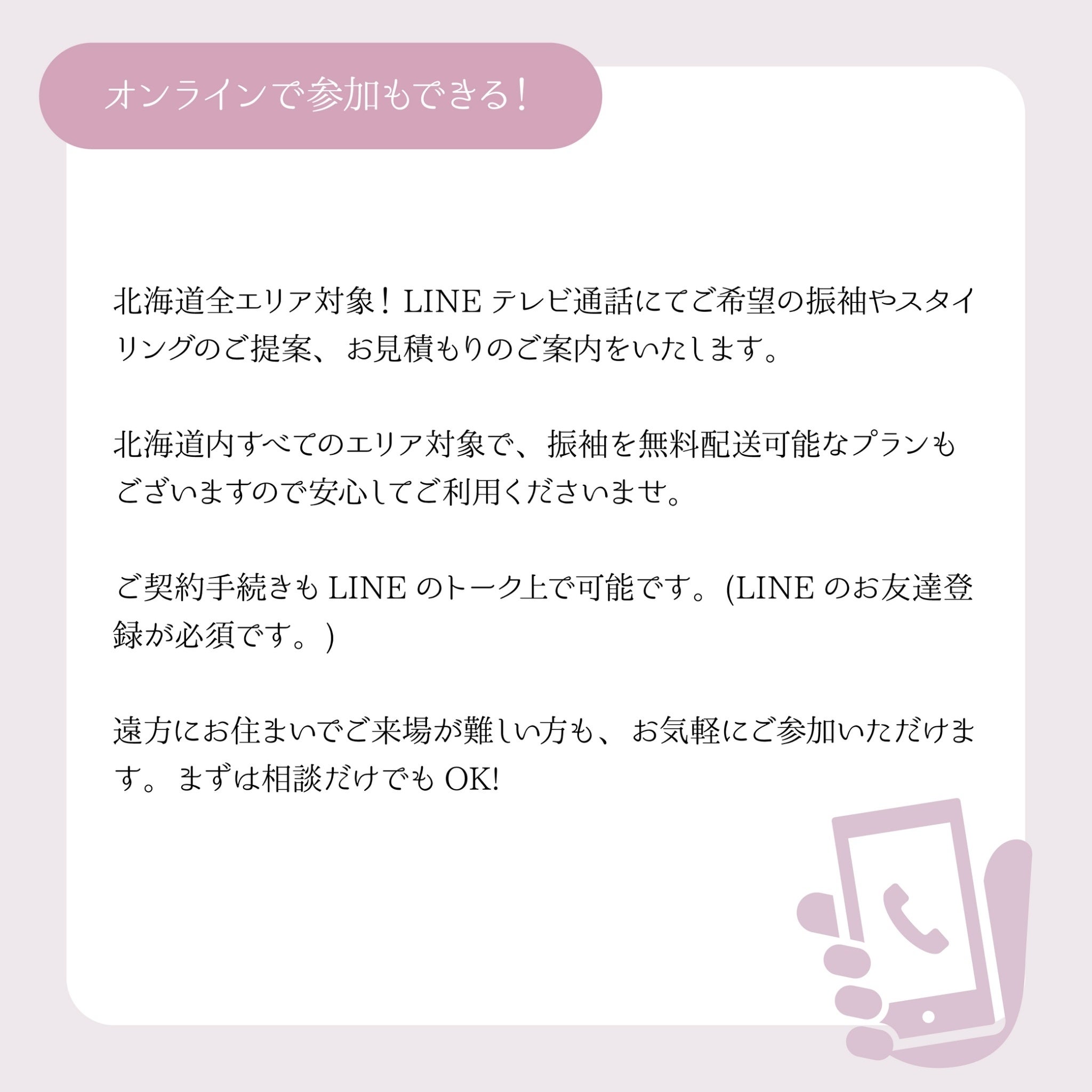 北海道全エリア対象でLINEテレビ通話にてご希望の振袖やスタイリングのご提案、