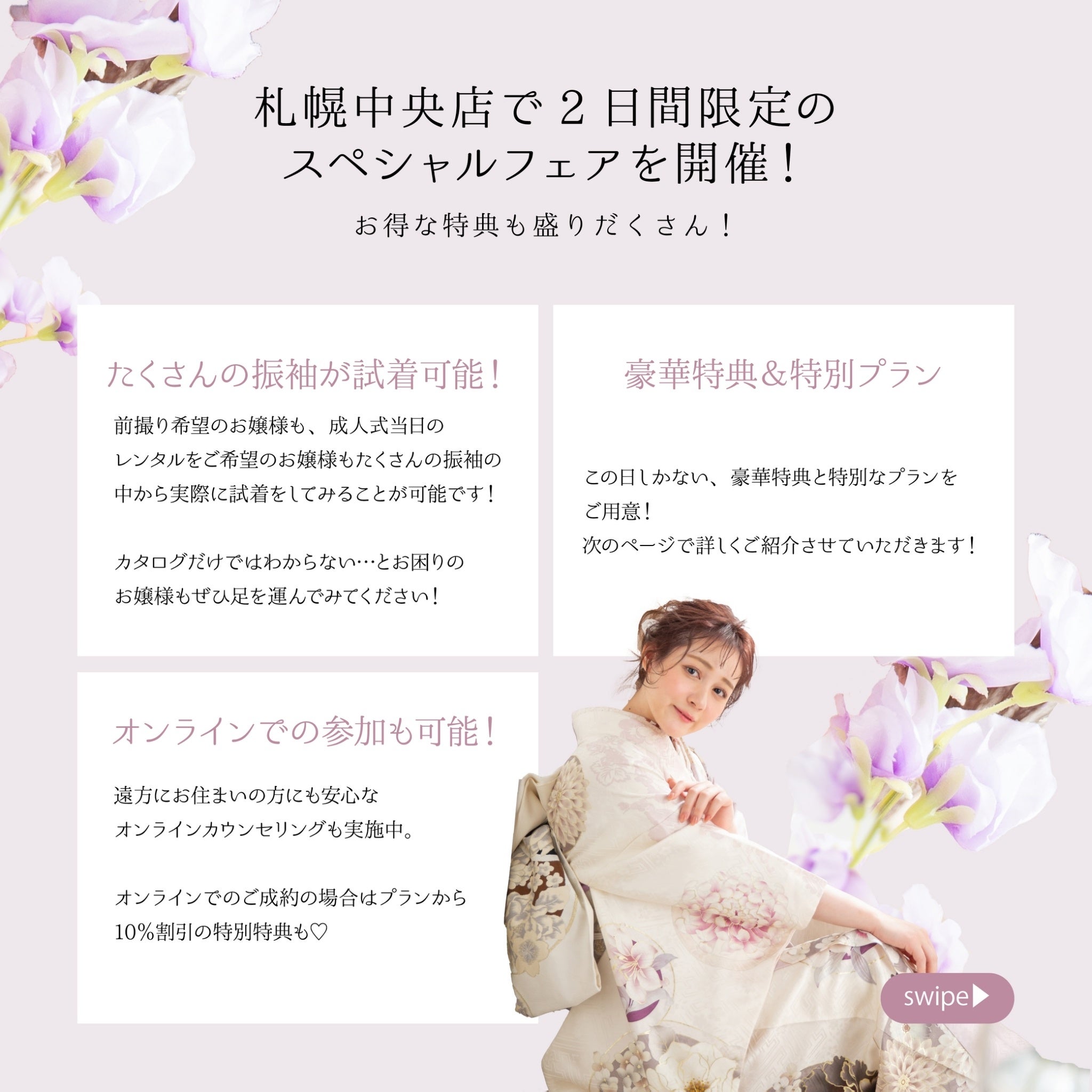 この時期だからこそご案内可能なお振袖やキャンペーンをご用意しております。