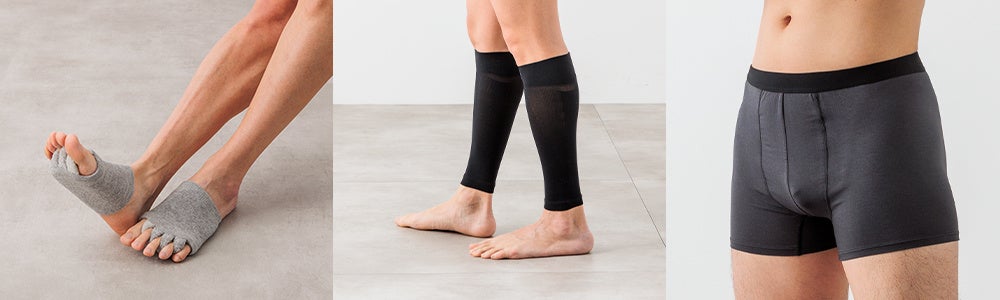 この度発売するメンズ用のインナーケアアイテムは、足指開放フットカバー、着圧ふくらはぎサポーター、ボクサーパンツの3アイテムです。日々の疲れを癒してくれる男性必見のケアアイテムとなっています。