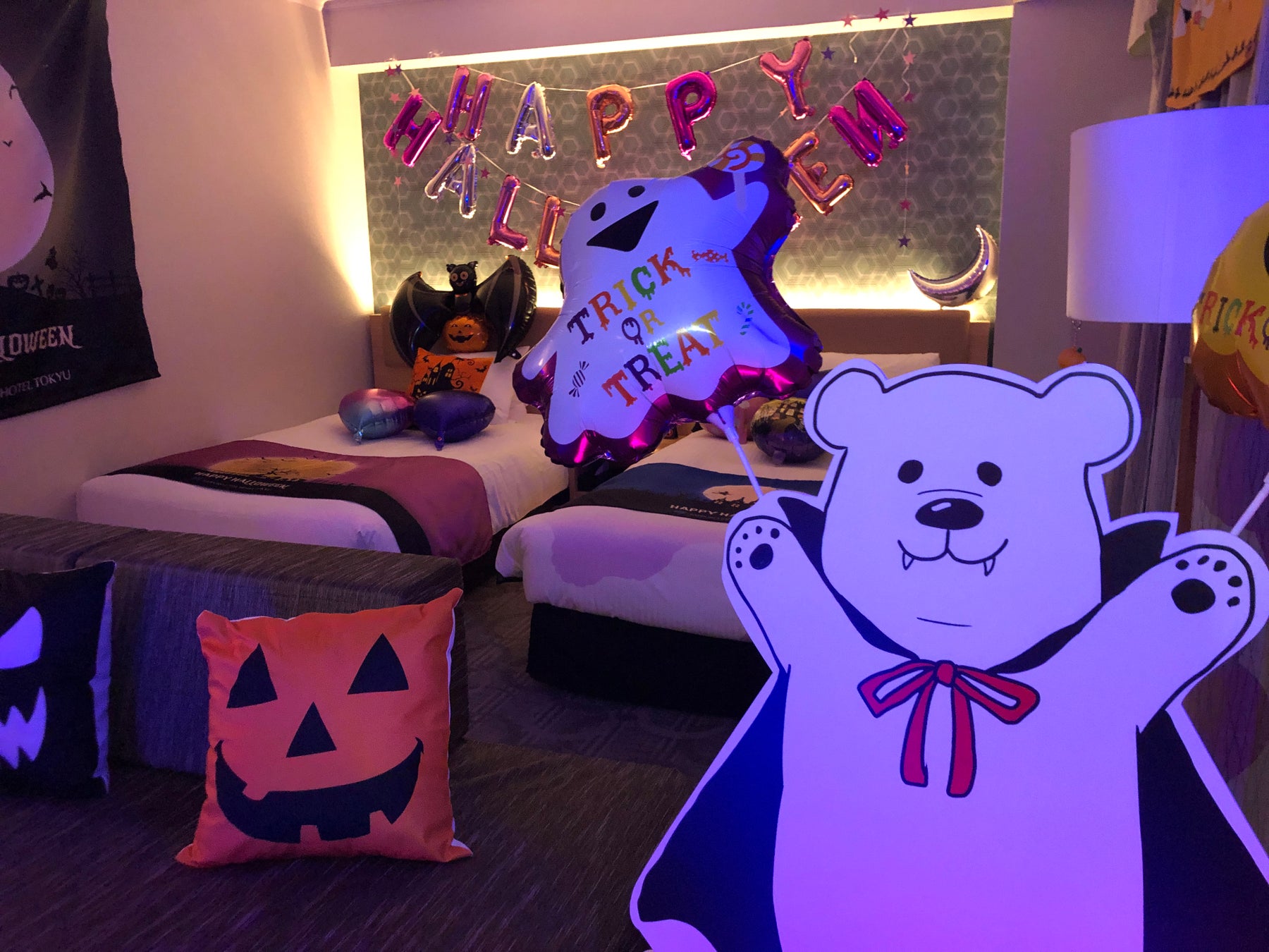 その他にも、ジャック・オ・ランタンやコウモリなど、様々な装飾がお部屋に施されており、トイレや洗面台、バスルームまで、にぎやかで楽しいハロウィンを演出。また、壁面やティーテーブルはライトアップもできるので、ロマンティックな気分を味わうことができます。