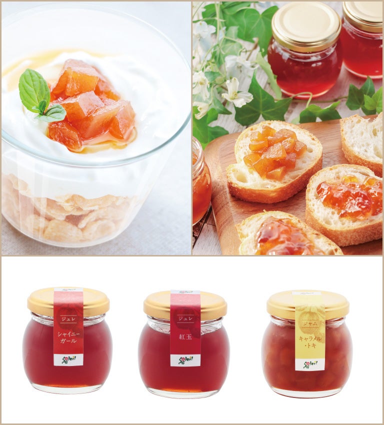 りんごを煮込み、その煮汁を最後の一滴まで丁寧に濾して仕上げた、甘みと酸味のバランスが良い紅玉とシャイニーガールのジュレ。味わい深いキャラメルにトキの果肉をたっぷり合わせたジャムが、限定セットに登場。