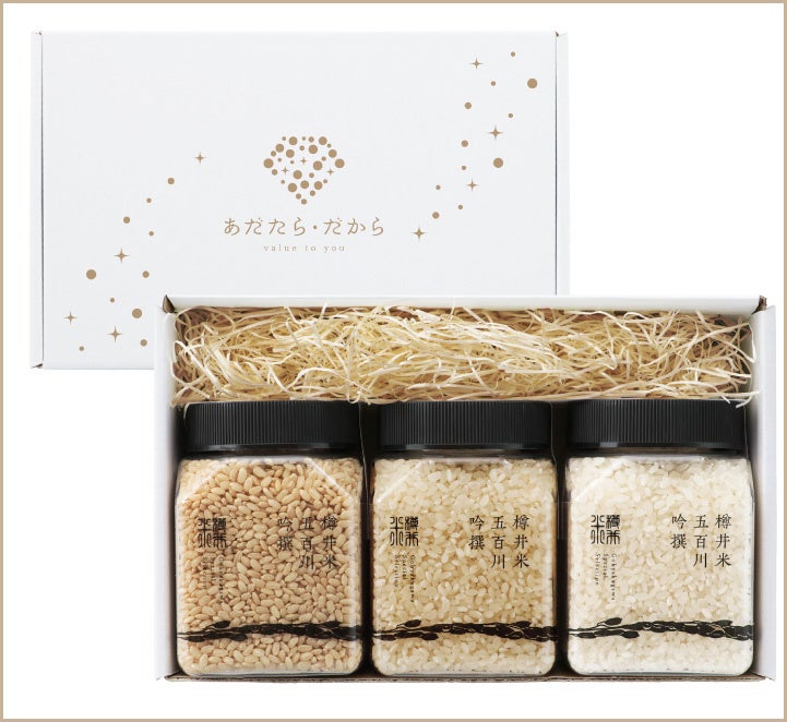 すすめする自社ブランド「樽井米」シリーズ。その中でも、一等米の五百川をさらに厳選し、玄米・五分づき・白米の3種のセットにしました。精米の「分づき」の違いを比べるも良し、好みのブレンドを楽しむも良し。