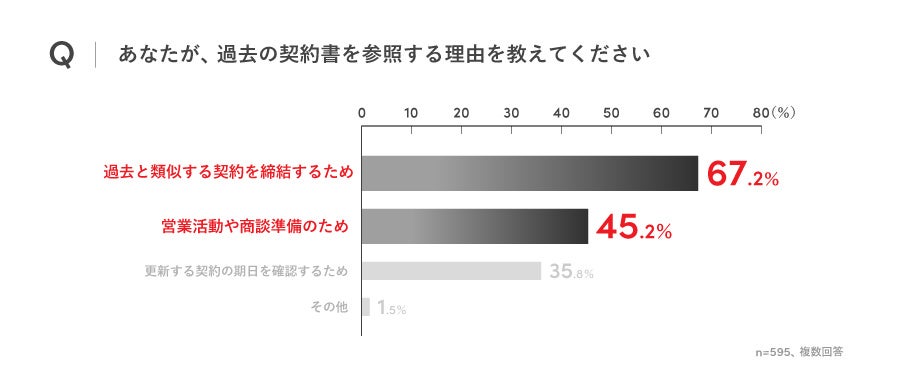 - 過去の契約書を参照する理由の上位は「過去と類似する契約の締結」「営業活動や商談準備」。半数近くが過去の契約書を営業活動や商談準備に活用している