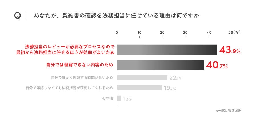 前問で契約書の内容確認を「法務担当に任せている」と答えた462名にその理由をたずねたところ、第1位は「法務担当のレビューが必要なプロセスなので最初から法務に任せる方が効率がよい」(43.9%)、第2位は「自分では理解できない内容のため」(40.7%)となりました。この結果からは、契約書の確認作業が法務担当に集中してしまい業務負荷になっている可能性がうかがえます。