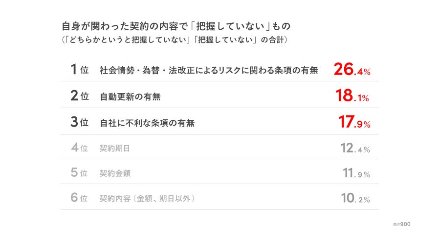 自身が関わった契約内容の詳細をどの程度把握しているかたずねたところ、「把握していないもの」の上位は第1位「社会情勢・為替・法改正によるリスクに関わる条項の有無」(26.4%)、第2位「自動更新の有無」(18.1%)、第3位「自社に不利な条項の有無」(17.9%)となりました。
