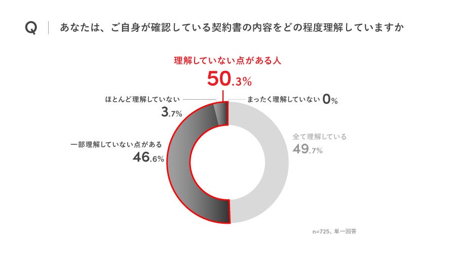 - 契約書の内容を自分で確認していても、約半数は内容について「理解していない点」がある