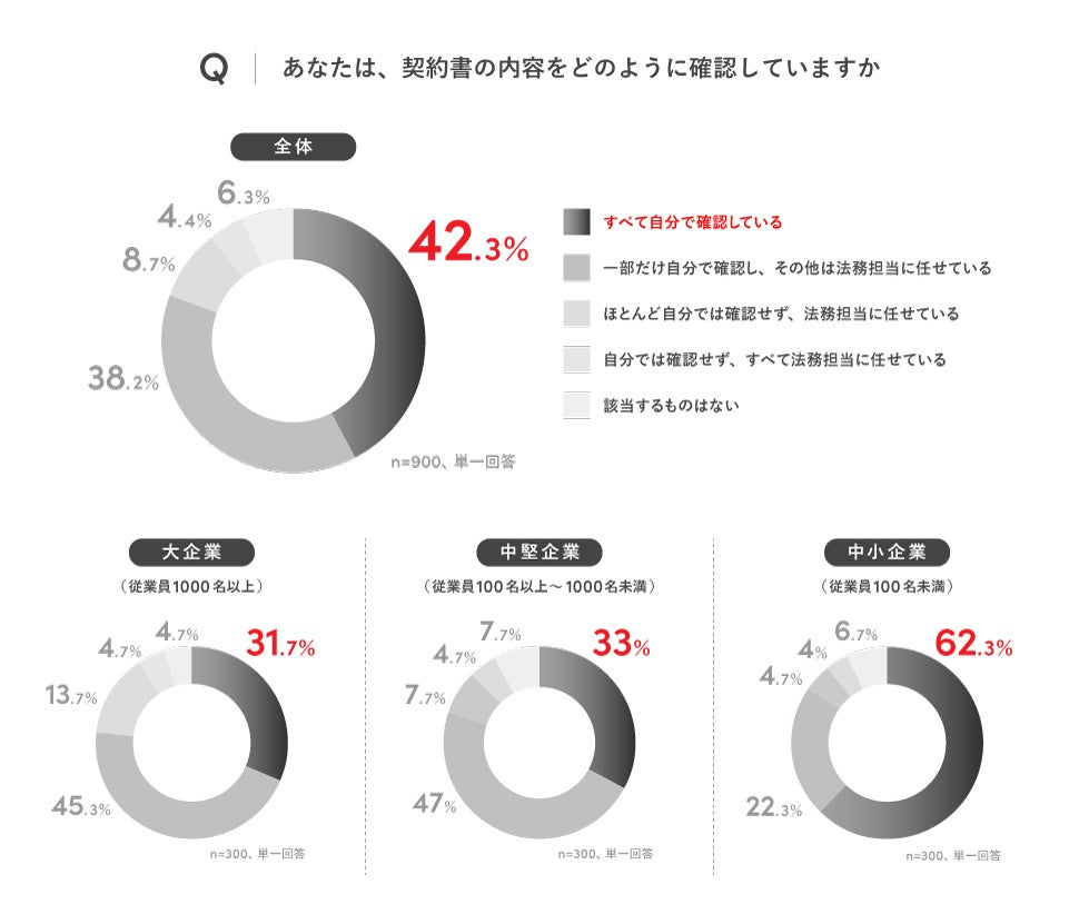 法務以外の職種で契約締結業務に関わる900名のビジネスパーソンのうち、契約書の内容を「すべて自分で確認している」と答えたのは42.3%でした。企業規模別に見ると、「すべて自分で確認している」のは大企業では31.7%、中堅企業は33%、中小企業は62.3%という結果となり、企業規模が大きくなるほど内容の確認が法務任せという傾向がありました。