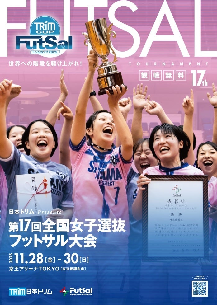 日本トリムPresents 第17回全国女子選抜フットサル大会を2025年11月28日(金)~30日(日)の3日間、東京都調布市・京王アリーナTOKYOにて開催いたします。