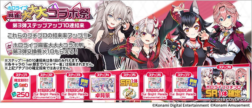 イベント期間中、「ホロライブ麻雀大大大コラボ祭 第3弾ステップアップ10連招来」や「ホロライブ麻雀大大大コラボ祭 第3弾招来」で「百鬼あやめ」、「大神ミオ」、「獅白ぼたん」、「鷹嶺ルイ」の4名が新規描きおろしイラストや録りおろしボイスで「ホロライブプチプロ」として登場します。
