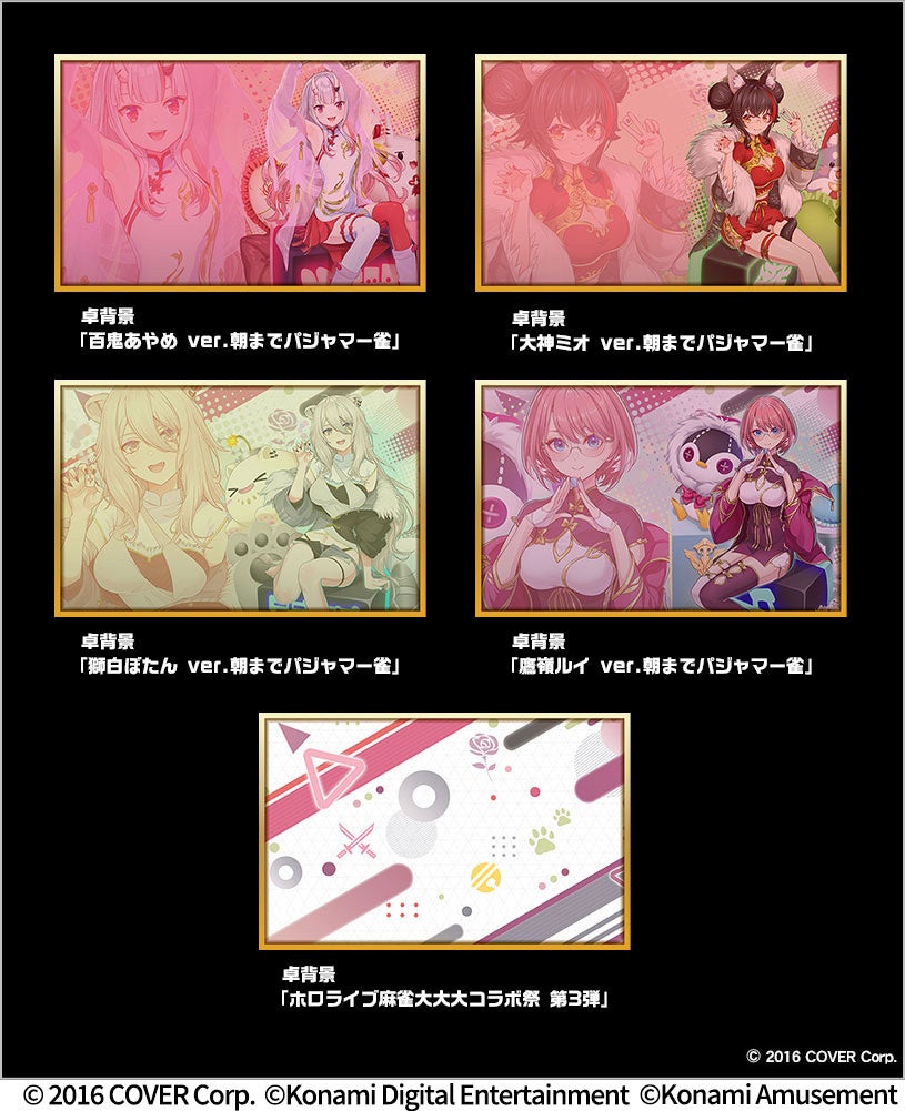 「ホロライブ麻雀大大大コラボ祭 第3弾ステップアップ10連招来」では、ホロライブ公式曲「Our Bright Parade」の対局BGMや、「百鬼あやめ」、「大神ミオ」、「獅白ぼたん」、「鷹嶺ルイ」の4名の集合卓背景など、対局を彩るアレンジアイテムがもらえます。さらに、それぞれのプチプロを入手すると、各タレントに対応した「ver.朝までパジャマー雀」プチプロを入手できる10連招来が解禁されます。