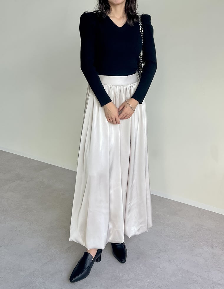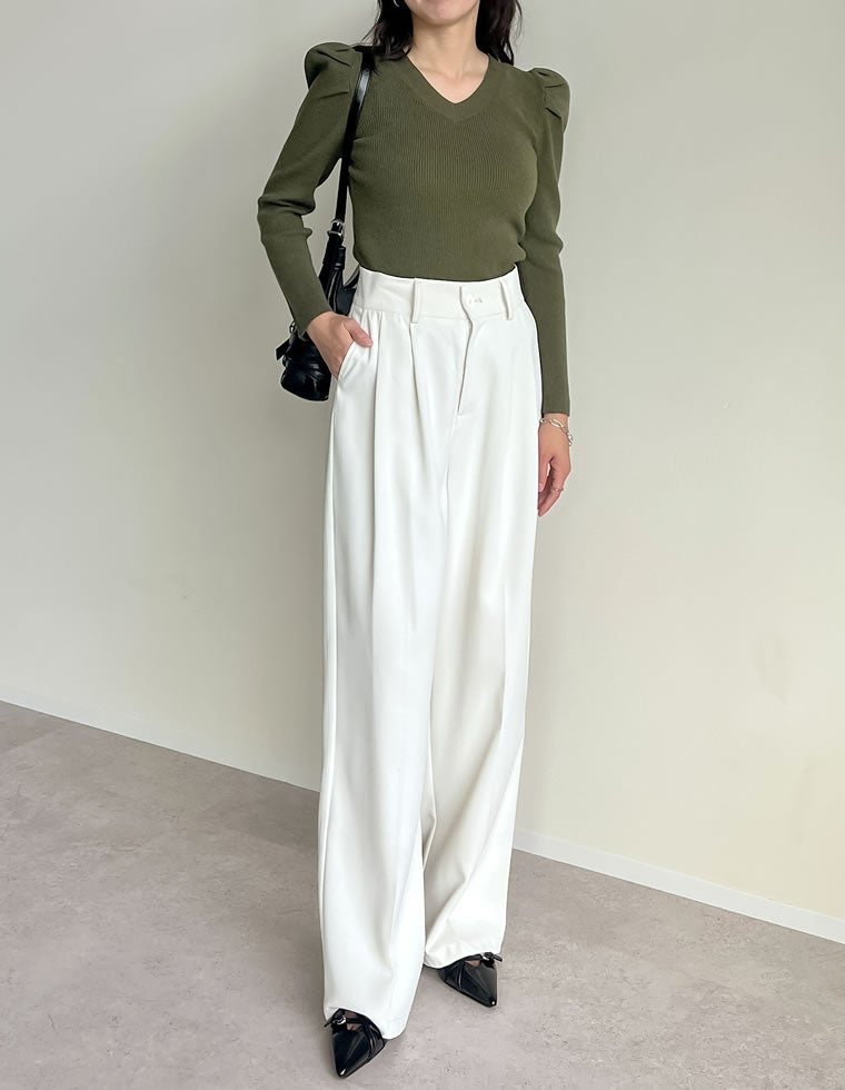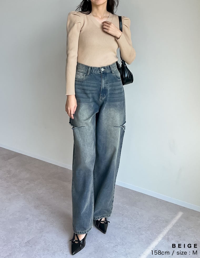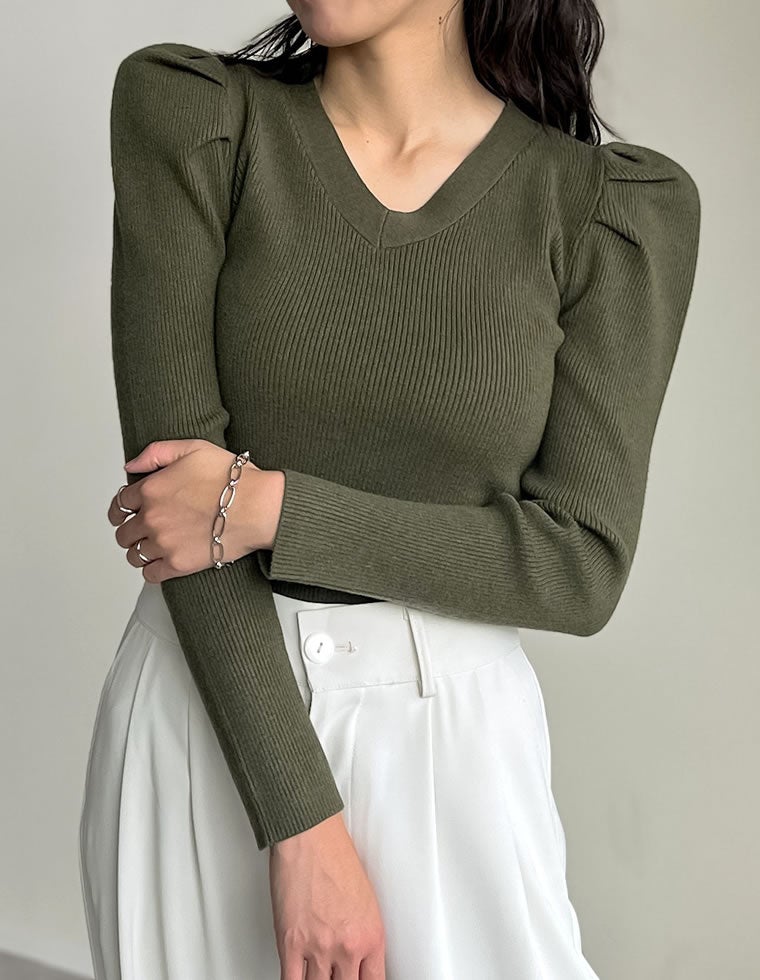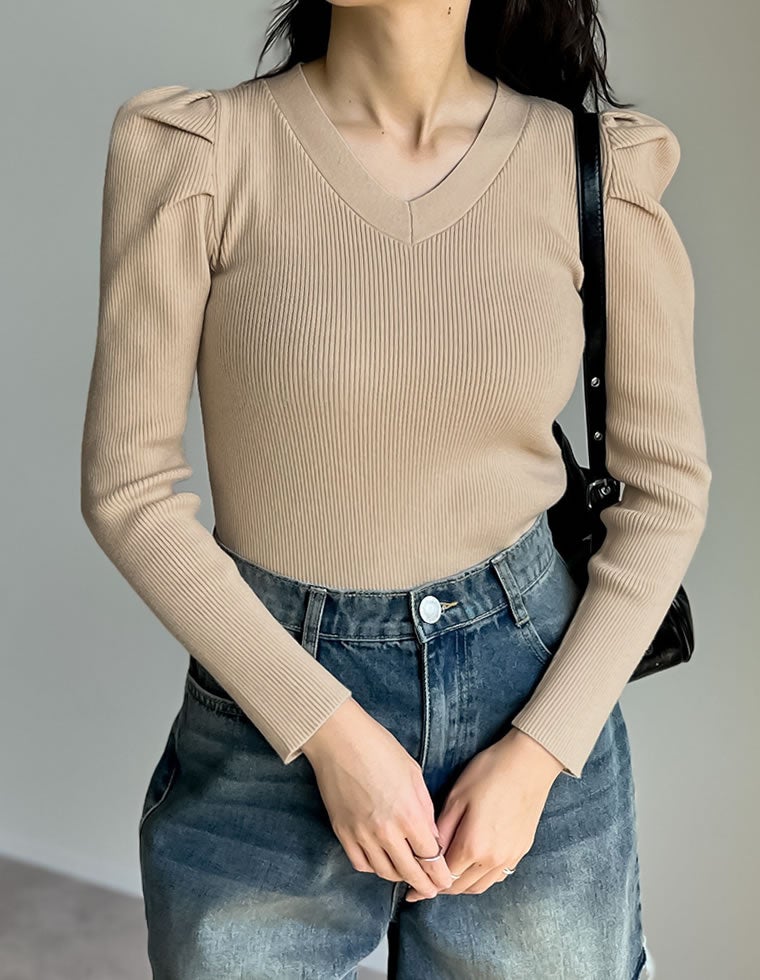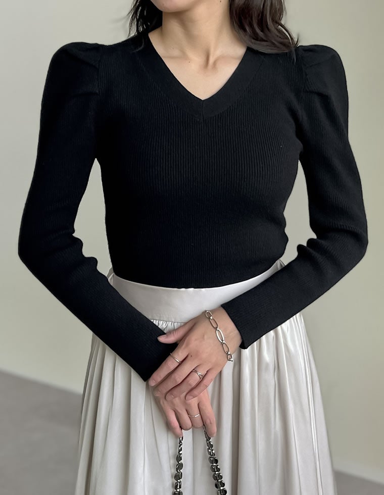 [全骨格きれい見え]Vネックパフスリーブニットトップス