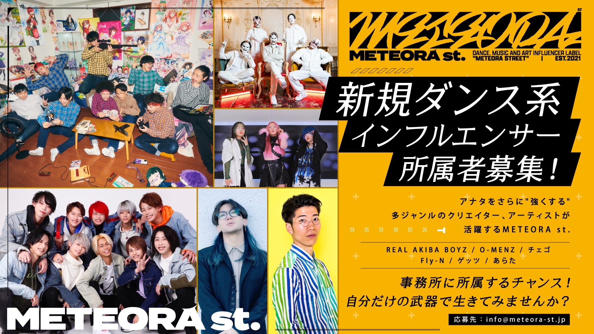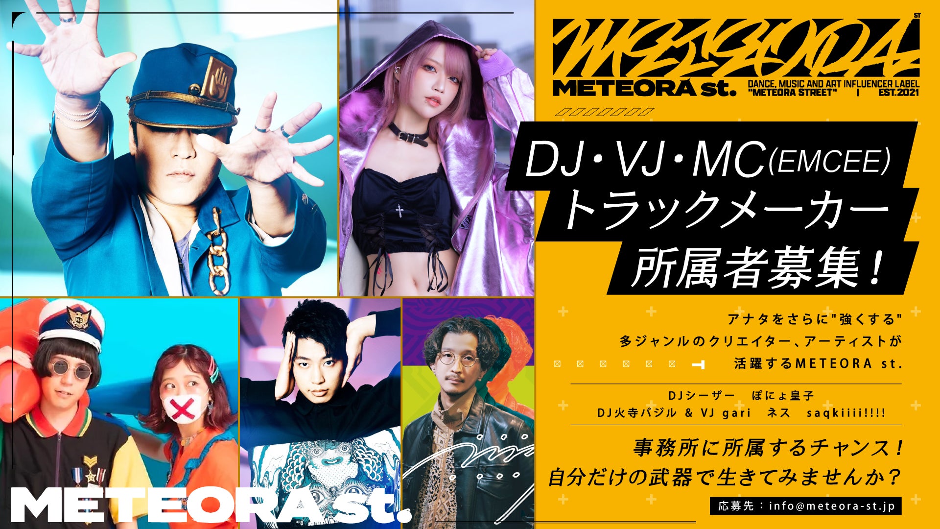 「METEORA st.」が新規タレントを発掘すべく新規のダンス系インフルエンサー・DJ・VJ・MC(EMCEE)・トラックメーカーの募集を開始する。