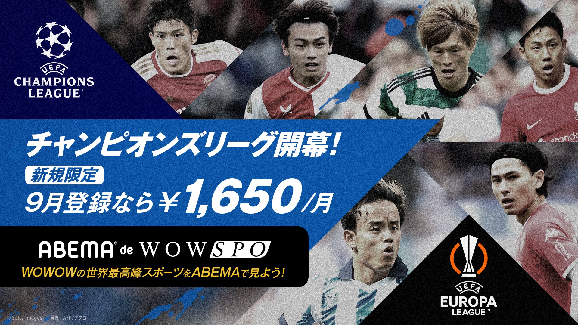 「ABEMA de WOWSPO(商品名:WOWSPO)」にて、UEFAチャンピオンズリーグ2024-25、ヨーロッパリーグ2024-25などの中継決定を記念して、「ABEMA」では9月4日(水)12時~9月30日(月)23時59分まで、約1ヶ月限定で通常月額1,980円(税込)のところ、本プラン加入月のみ月額1,650円(税込)になります。本キャンペーンの限定価格となり、10月1日(火)以降の会員登録は、通常月額1,980円(税込)となります。