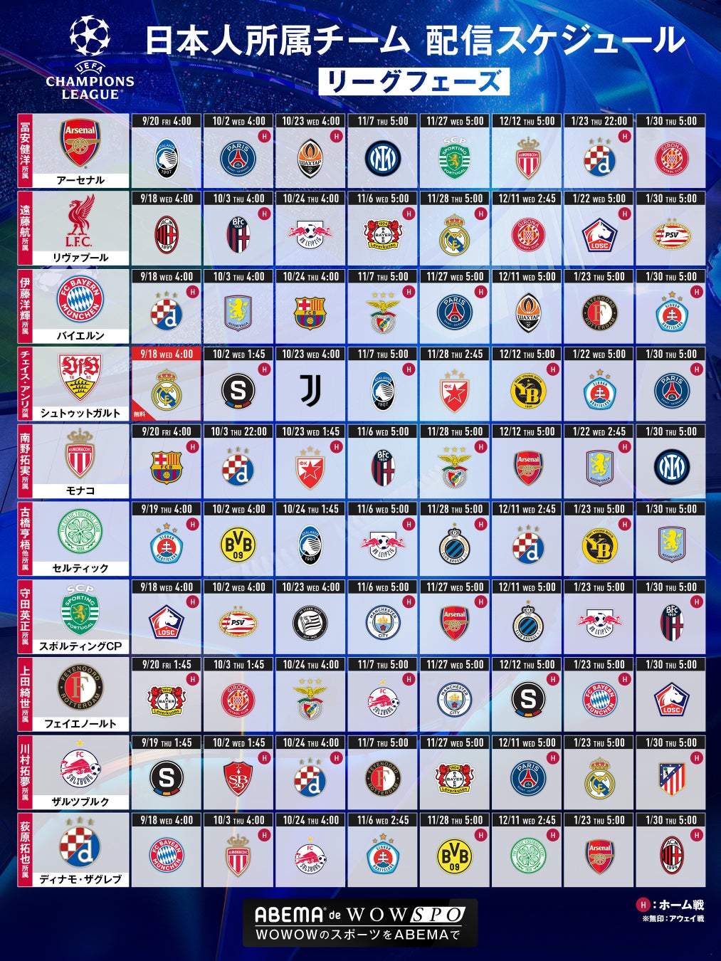 今回「ABEMA de WOWSPO(商品名:WOWSPO)」では、冨安健洋選手が所属するアーセナル、遠藤航選手が所属するリヴァプール、南野拓実選手が所属するモナコなどのクラブが出場するUEFAチャンピオンズリーグ2024-25シーズン、久保建英選手が所属するR・ソシエダ、毎熊晟矢選手が所属するAZなどのクラブが出場するUEFAヨーロッパリーグ2024-25シーズンのリーグフェーズから決勝までの注目試合(※)を生中継いたします。