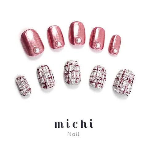 2つの質感のピンクネイル。サテンのような輝きとツイード風ネイルの両方を楽しめるデザインです。パッと目を惹くデザインなので、普段使いはもちろん、パーティーでドレスと合わせても可愛いネイルチップです。