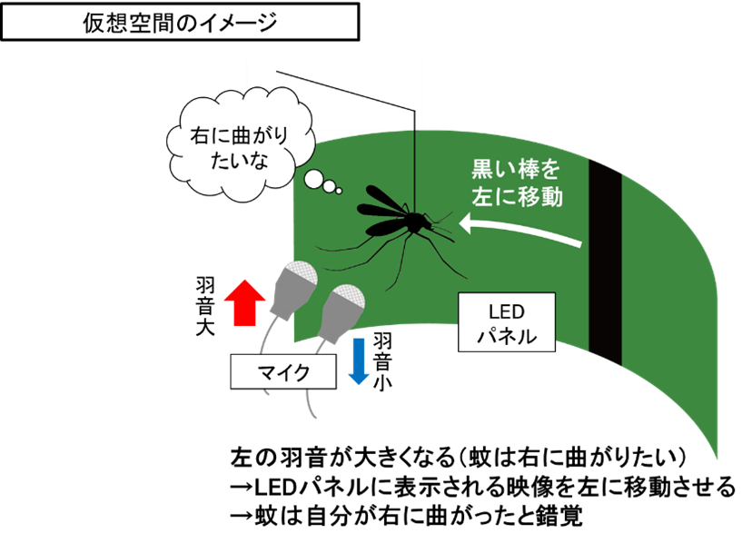 共同研究チームは、蚊が自分の意志で自由に飛んでいると感じるような“蚊に特化した”仮想空間を構築しました(図1)。この装置では、飛んでいる蚊の羽音をマイクで集めて計測することで、蚊の飛びたい方向を分析し、それに合わせて周囲の映像やニオイなどの感覚刺激を変化させます。0.005秒ごとに感覚刺激を変化させられるため、蚊の微細な行動変化を捉え、さまざまな感覚刺激がどのように受容されているかを推測できます。