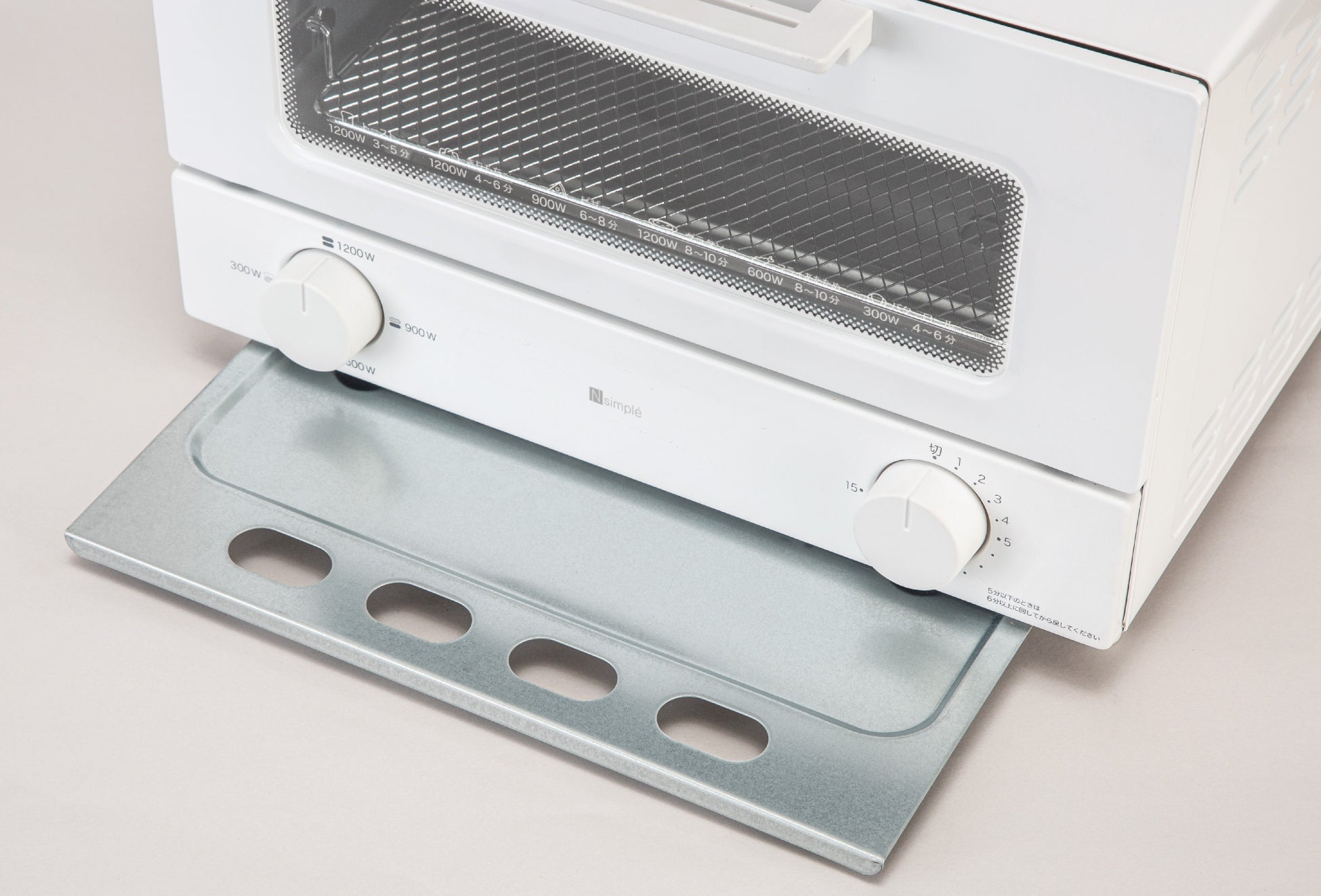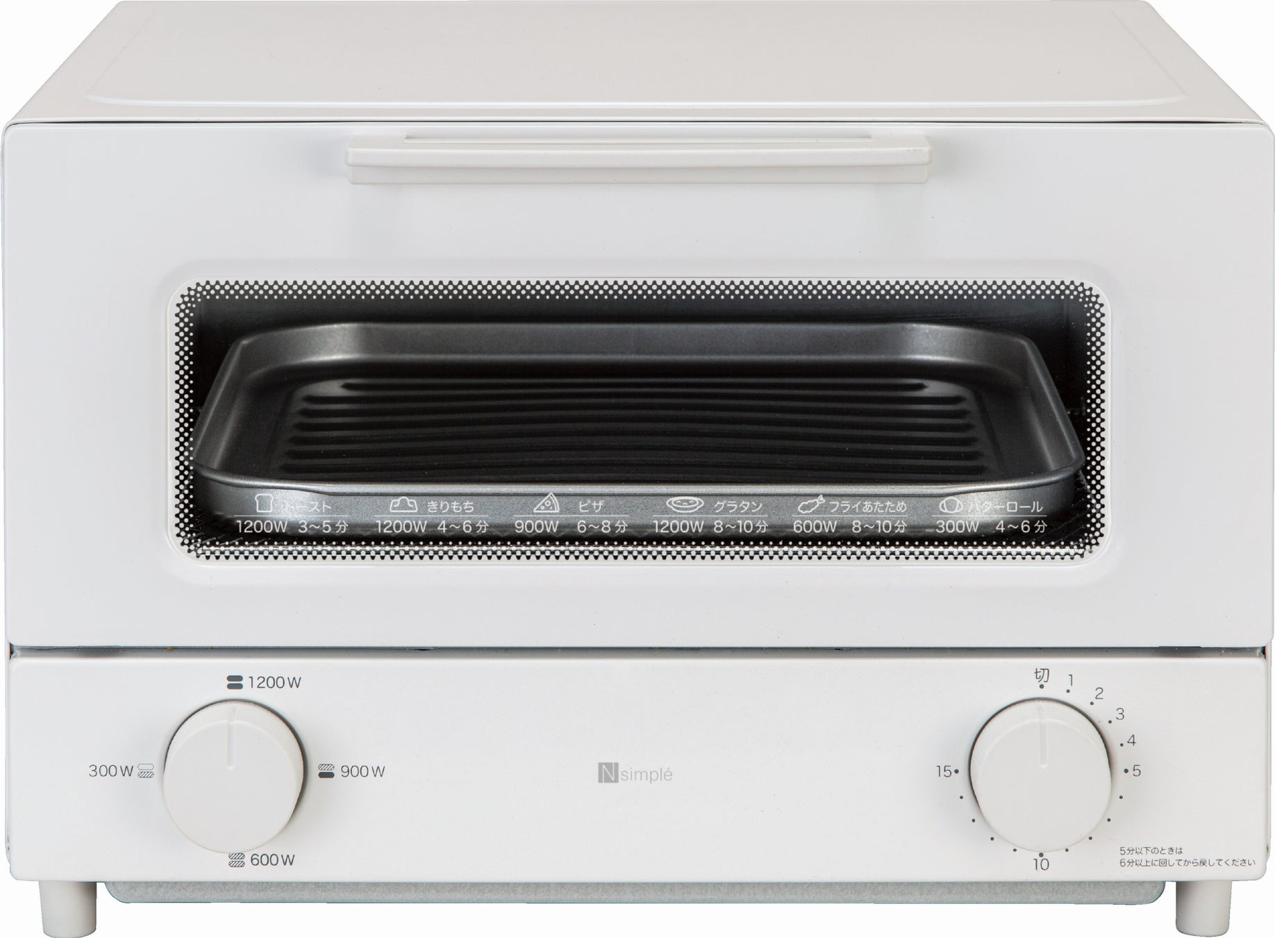 熱源は4段階のワット数切替(1200W/900W/600W/300W)が可能で、タイマーは最長約15分まで選べます。料理に合わせて火力の切り替えができるため、お好みの焼き加減に調整していただけます。