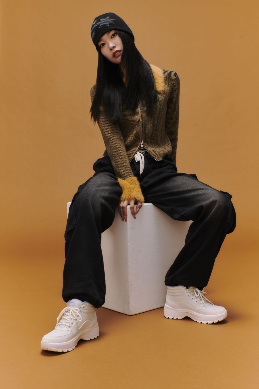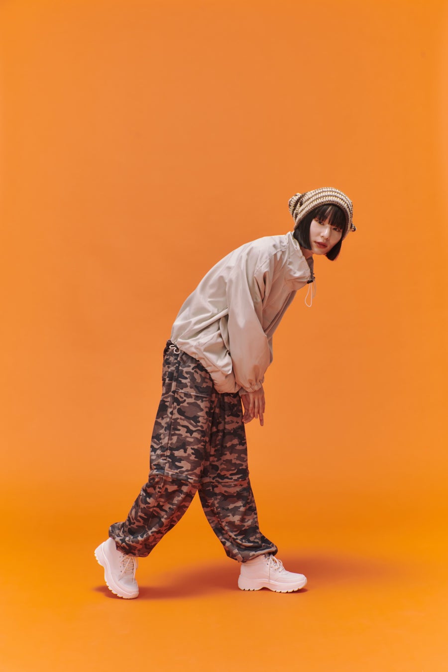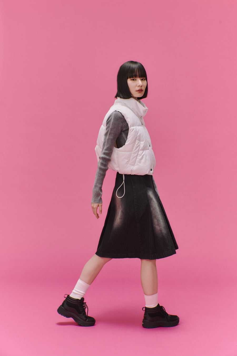 今回のビジュアルには、ガールズグループ「ExWHYZ」のyu-kiさんと、モデルの大沢明花さんを起用しています。「WONBAT HI」を着用し、ミニ丈のスカートやボリュームのあるパンツなど様々なボトムスと組み合わせたスタイルを提案します。