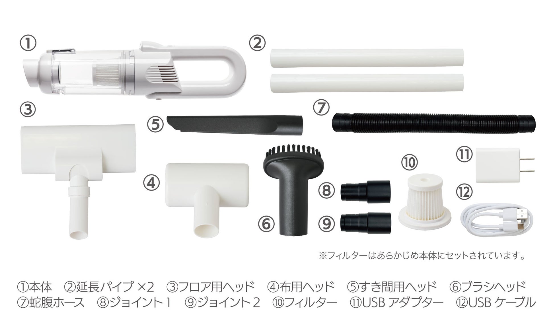 4種のヘッド&ノズル付き!豊富なパーツで床などの広い面からソファやベッドの下・エアコン・車の中など、隅々までお掃除できます。