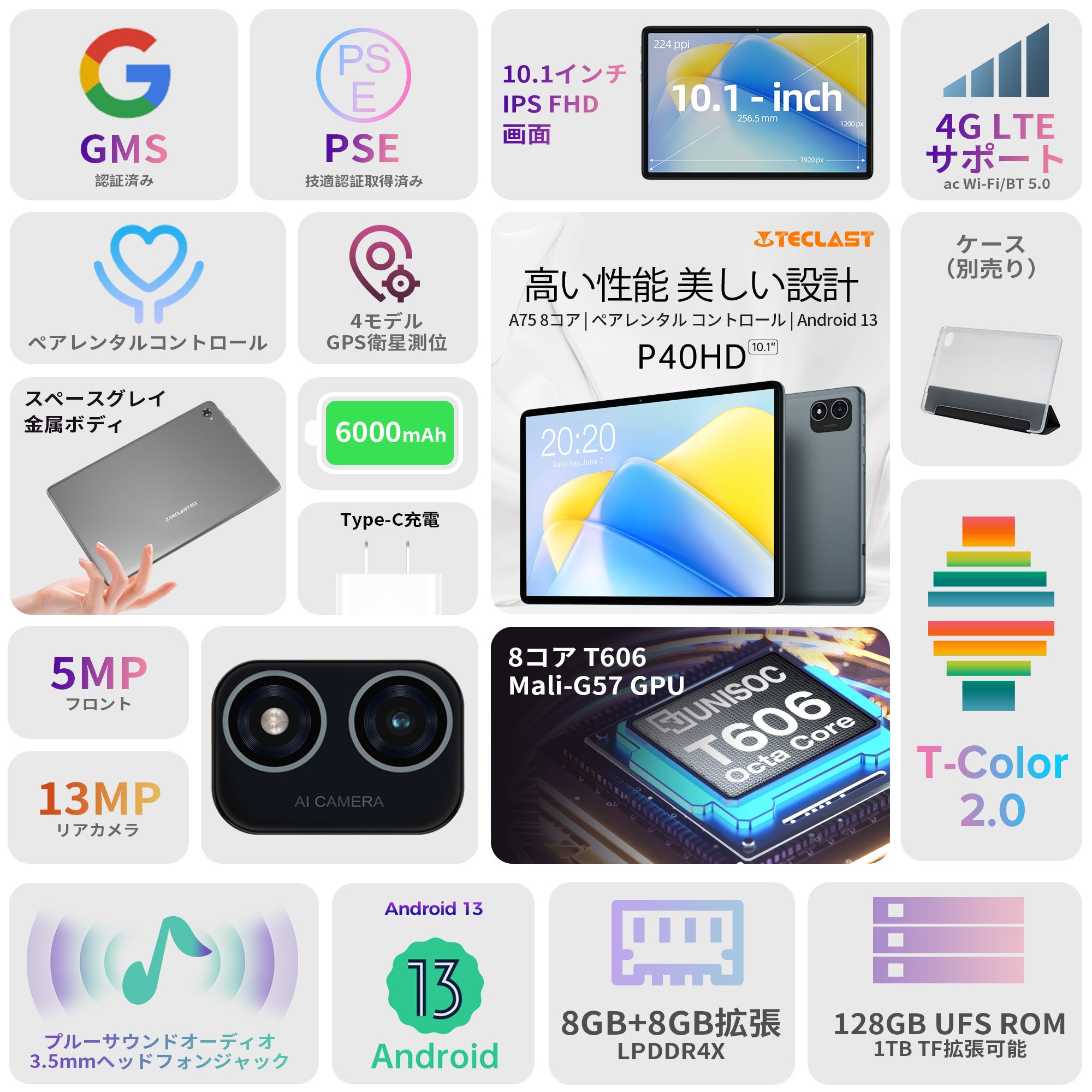 10インチ / Android 13 / 16GB(8+8拡張)RAM+128GB ROM+1TB TF拡張 / FHD IPSインセルディスプレイ / 4G LTE+WiFiモデル / Widevine L1対応 / GPS機能サポート / 3.5mmヘッドホン端子