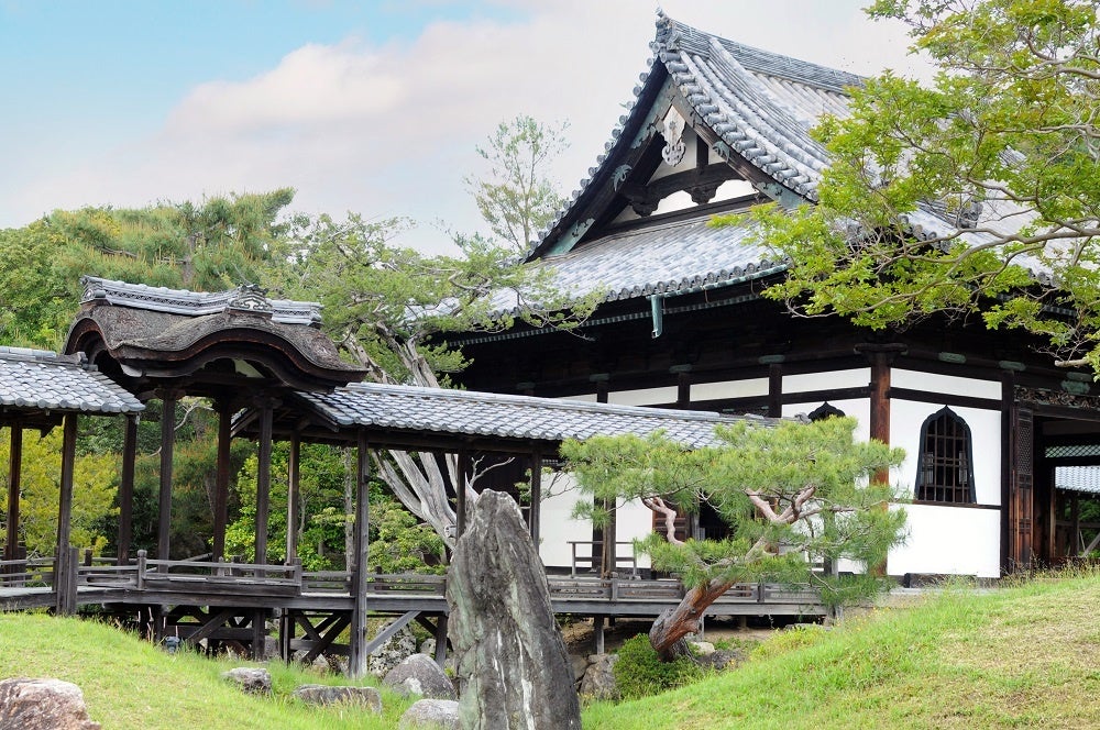 A Zen temple of the Rinzai School Kenninji Sect of Buddhism that was established in 1606 by Toyotomi Hideyoshi’s legal wife, Kita-no-Mandokoro, or Nene, in memory of her late husband, Kodaiji Temple has buildings designated as important cultural properties of Japan that still retain their original appearance from the time of their construction in the Momoyama period, including Kangetsudai (Moon View Pavilion) relocated from Fushimi Castle and Otamaya, which houses Nene’s grave and is famous for elegant Kodaiji Makie, a technique of sprinkling gold or silver powder on lacquer. The temple is also popular as one of Kyoto’s best spots for viewing autumn leaves and cherry blossoms. Many events are held, including special evening viewings in spring and summer, as well as special Kodaiji tea parties.