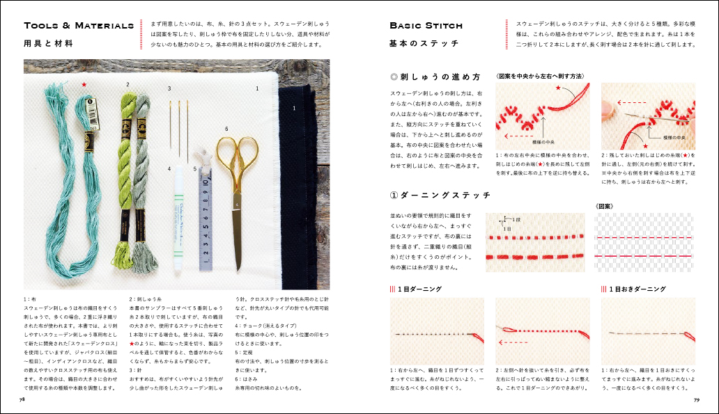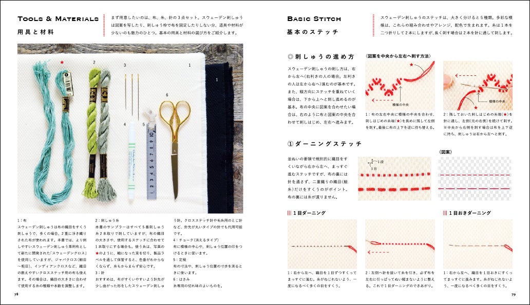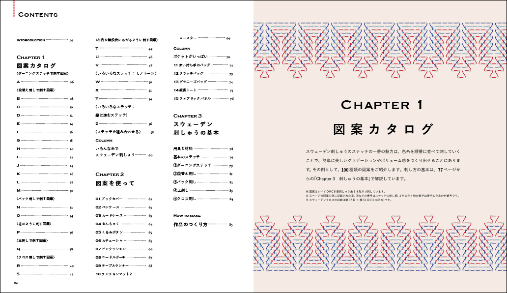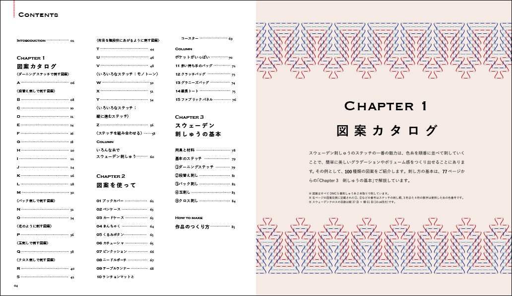 図案カタログA〜Z ダーニングステッチで刺す図案、段替え刺しで刺す図案、バック刺しで刺す図案、花のように刺す図案、玉刺しで刺す図案、クロス刺しで刺す図案、布目を階段状にあがるように刺す図案、いろいろなステッチモノトーン、いろいろなステッチ縦に進むステッチ、ステッチを組み合わせる、コラム いろんな糸でスウェーデン刺しゅう/図案を使って ブックカバー、ペンケース、カードケース、きんちゃく、くるみボタン、カチューシャ、ピンクッション、ニードルポーチ、テーブルランナー、ランチョンマットとコースター、コラム ポケットがいっぱい、赤い持ち手のバッグ、クラッチバッグ、縦長トート、ファブリックパネル/スウェーデン刺しゅうの基本 用具と材料、基本のステッチ/作品の作り方