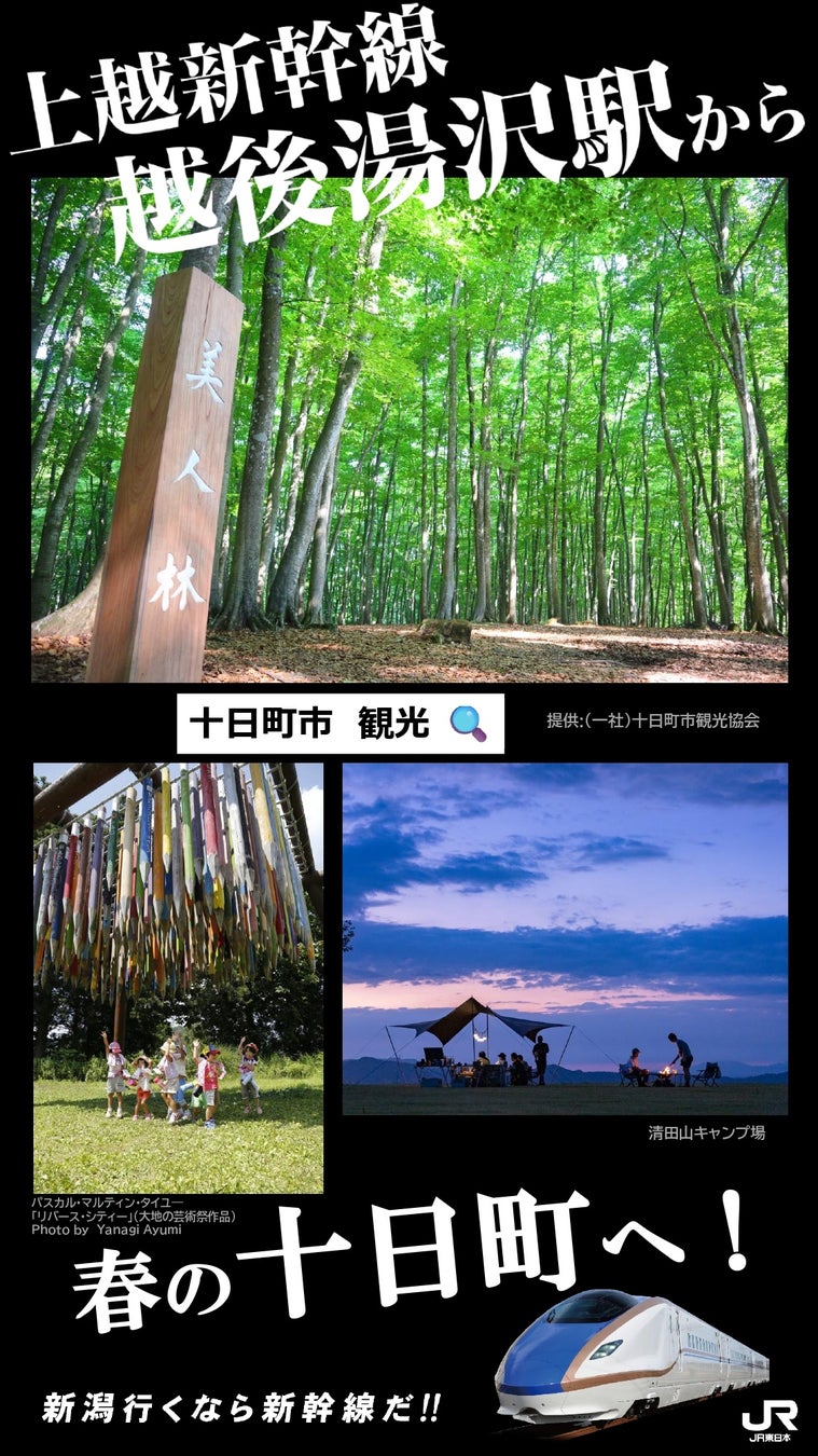 2025年5月5日~18日のPRエリアは十日町市です。長い冬が終わり雪が解け田んぼに水が張られた「棚田の水鏡」、ブナの立ち姿が美しく若葉が芽吹く「美人林」、大地の芸術祭の屋外常設作品、大自然に触れられる「越後妻有清田山(せいだやま)キャンプ場」をご紹介!今しか見られない春の風景をぜひ十日町でご覧ください。