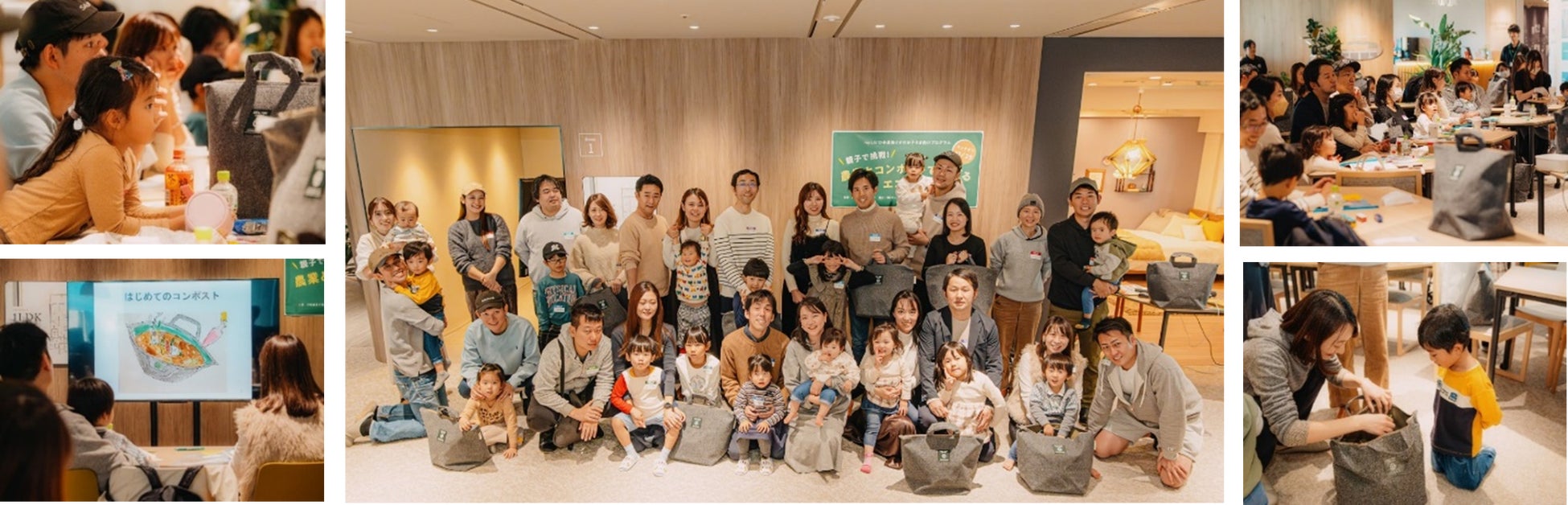 2024年11月23日には、実際に親子でコンポストについて楽しく学び、体験する機会として「LIVIO Life Design! SALON」でキックオフイベントを開催し、親子12世帯38名(未就学児から小学生までの子どもとその保護者)の方に参加いただきました。コンポスト講座では、紙芝居形式の「ふうちゃんのコンポスト」を通じて、生ごみを捨てない暮らしやコンポストの基本的な使い方を親子で楽しく学んでいただきました。また、実際の生ごみを使ったデモンストレーションが行われ、使用中のコンポストの実物を見ていただく時間も設けました。子どもたちは紙芝居に夢中になり、身を乗り出して聞き入っていました。