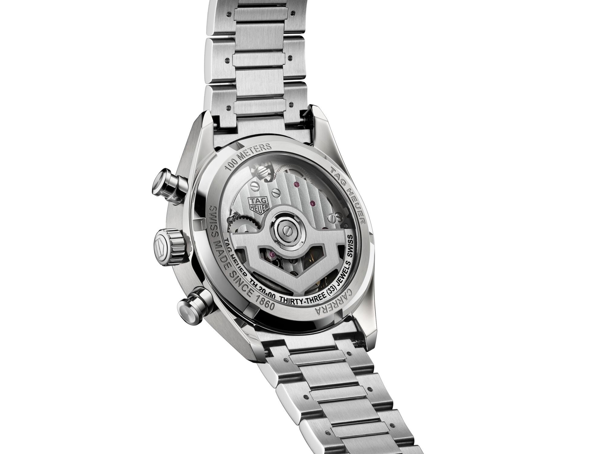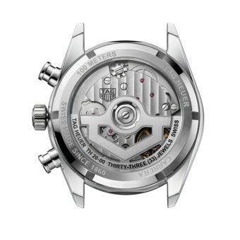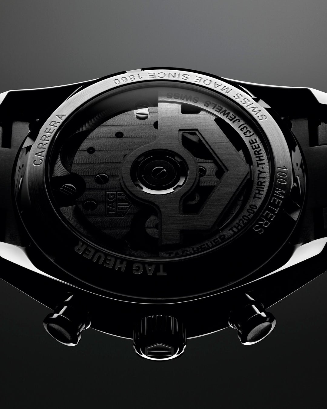 「タグ・ホイヤー カレラ クロノグラフ」のケースバックからは、クロノグラフに搭載されたムーブメントであるTH20-00を確認できます。