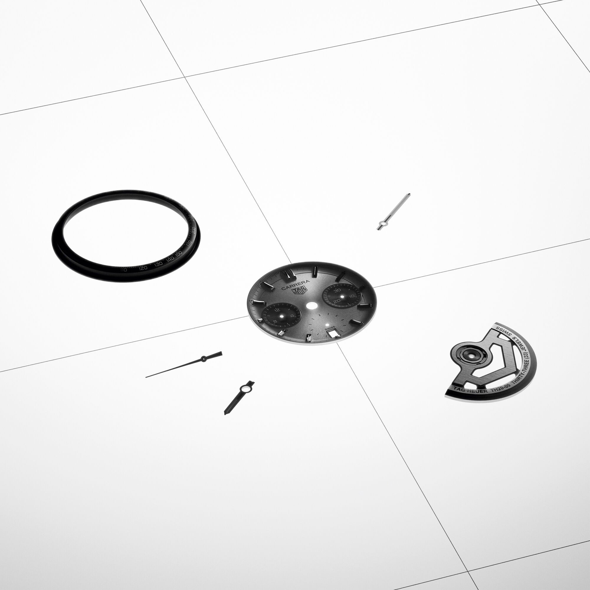 39 mm径のステンレススティール製ケースには1970年代のホイヤー カレラモデルを彷彿とさせるサファイアガラスを用い、ダイヤルの外周とケースの間に配置されたタキメーターにシームレスにつながるようデザインし直しました。コントラストの強いブラックでカーブを描くフランジとロジウム仕上げのカーブインデックスが一体化し時計の美しさを際立たせ、より広い視野角を確保し、ジャックの当初の目的を維持しています。