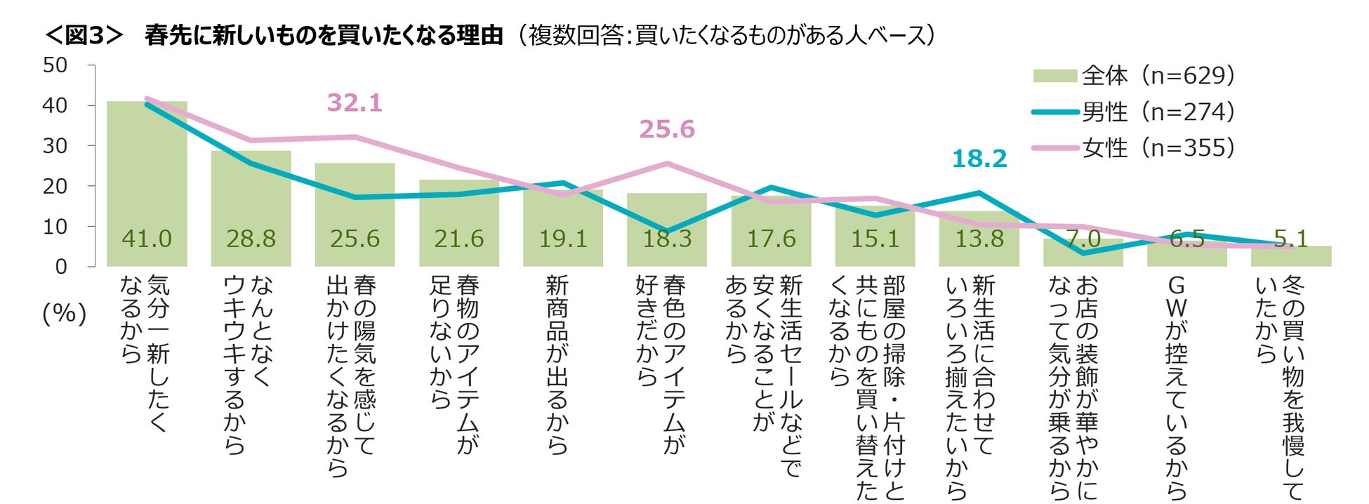 女性は、「春の陽気を感じて出かけたくなる」と「春色のアイテムが好き」が高いことが特徴的。また、男性の「新生活に合わせていろいろ揃えたい」が高めである。