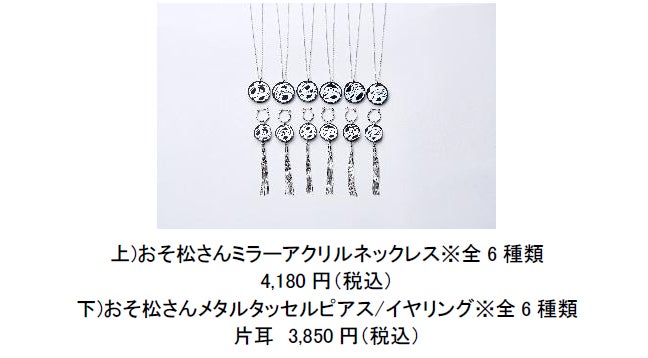 松野家6人の名前をデザインしたピアス/イヤリングが登場。キラキラのミラーアクリルと丈夫なメタルタッセルで、耳元で揺れるアクセサリー。ネックレスは、表はミラーアクリル、裏はブラックアクリルの2層構造で厚みと高級感のあるデザインです。