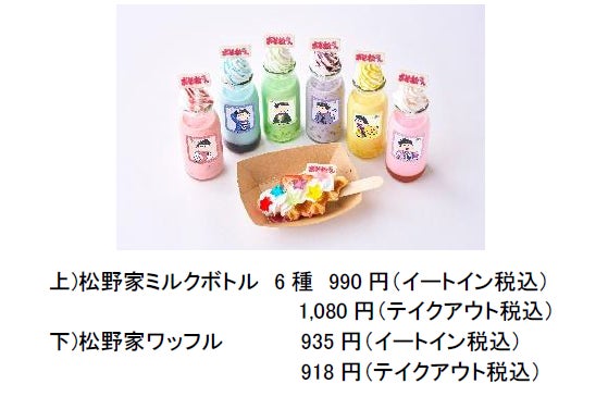 MILK MILK MILK!看板メニューのミルクボトルが、松野家6人のカラーで登場。お好きな色を選んで楽しめます。さらに、6色のキラキラゼリーが輝く限定ワッフルや、POP UP SHOP限定の描き下ろしイラストを使用したドリンクラベル・特典ノベルティも用意。この機会をお見逃しなく!