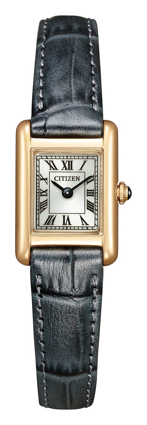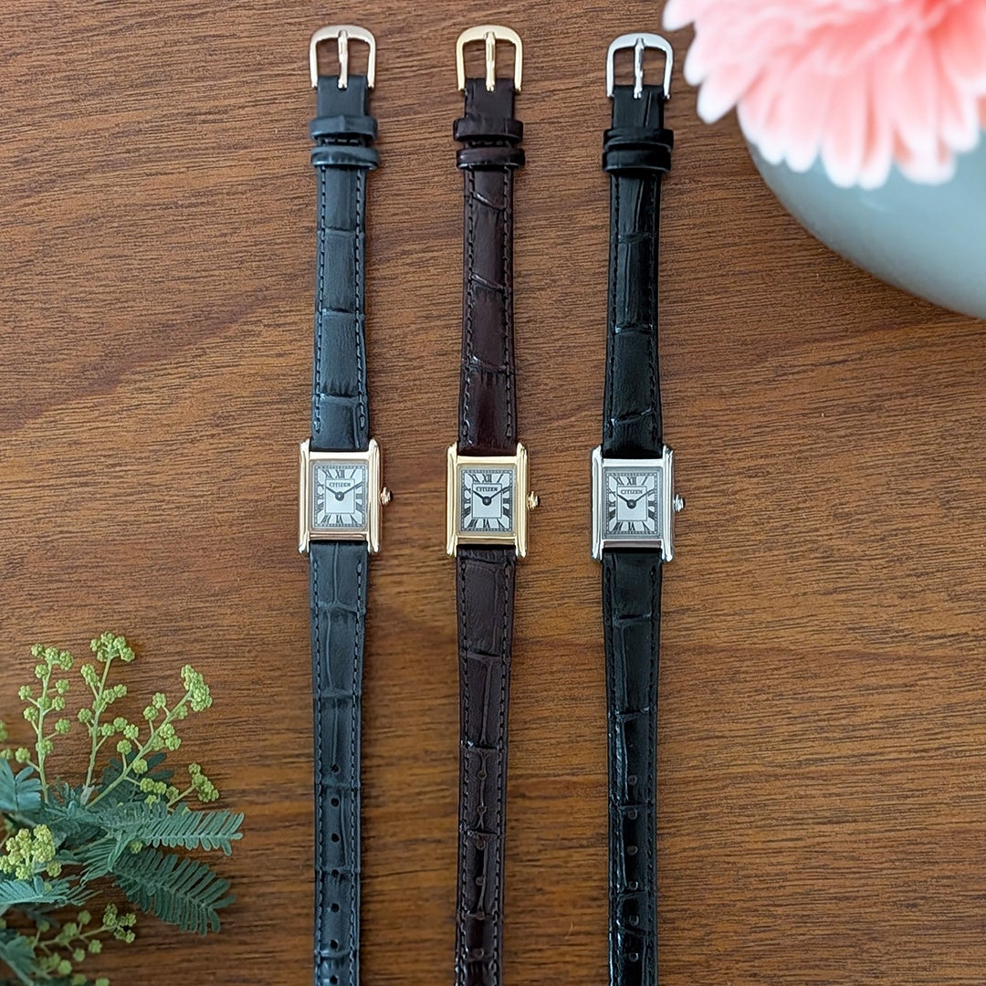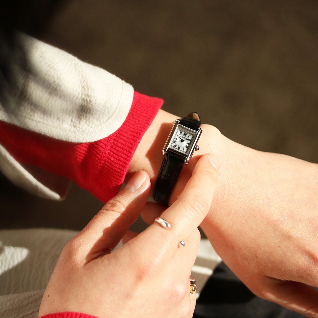 極小のエコ・ドライブムーブメントを搭載、サイドに丸みを持たせたケースが、洗練された優しさを醸し出します。ローマ数字で統一したインデックスと型押しを施した牛革バンドが、落ち着きのあるクラシカルな表情を際立たせています。少し大きめのりゅうずが小ぶりなケースにアクセントを添えてヴィンテージ調の雰囲気を漂わせております。