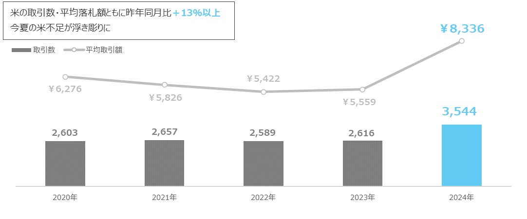 2024年の取引件数は過去最多、平均取引額は過去最高値を記録し、今夏の米不足はネットショッピング・オークション市場にも影響を及ぼしました。昨年同月比では、取引件数は13.5%増、取引額は15.0%増でした。