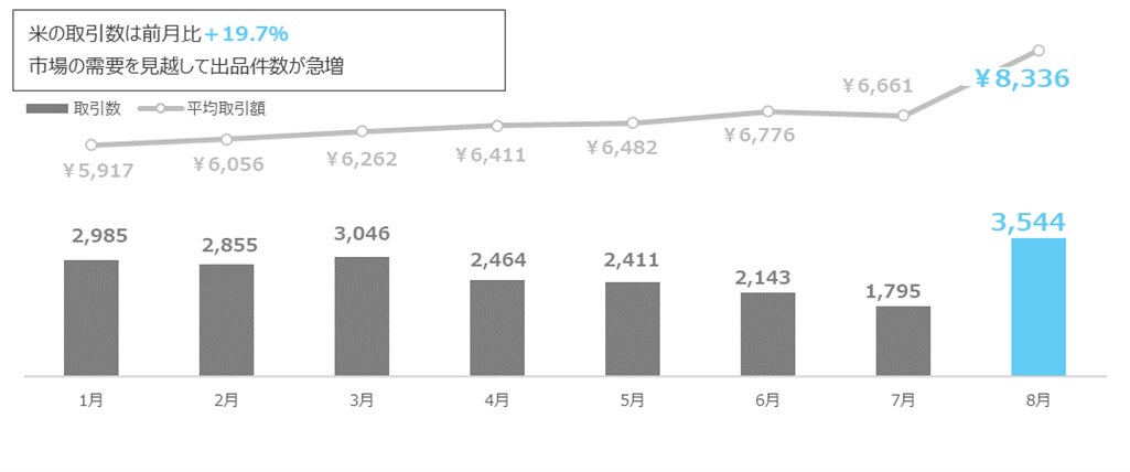 通常、出品数が増えると供給が需要に追いつくため平均取引額は落ち着くものの、過剰な米不足により、高値での取引が目立ちました。