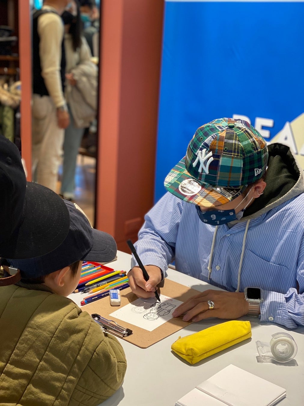 2021年12月16日(木)に、商業施設「三井アウトレットパーク台中港」内の移転を経て常設店舗として拡大オープンした「ビームス アウトレット 台中港」は、人の行き交うラウンジが内装コンセプトの、台湾で2店舗目となるアウトレット業態の常設店舗です。ゆとりある空間に、家族連れの多い店舗特性を活かしたワークショップを実施できるイベントスペースや、写真撮影ができるハート型のフォトスポットを設けています。オープンを記念して、イベントスペースではイラストレーター「weiweiboy」による似顔絵ワークショップを開催しました。