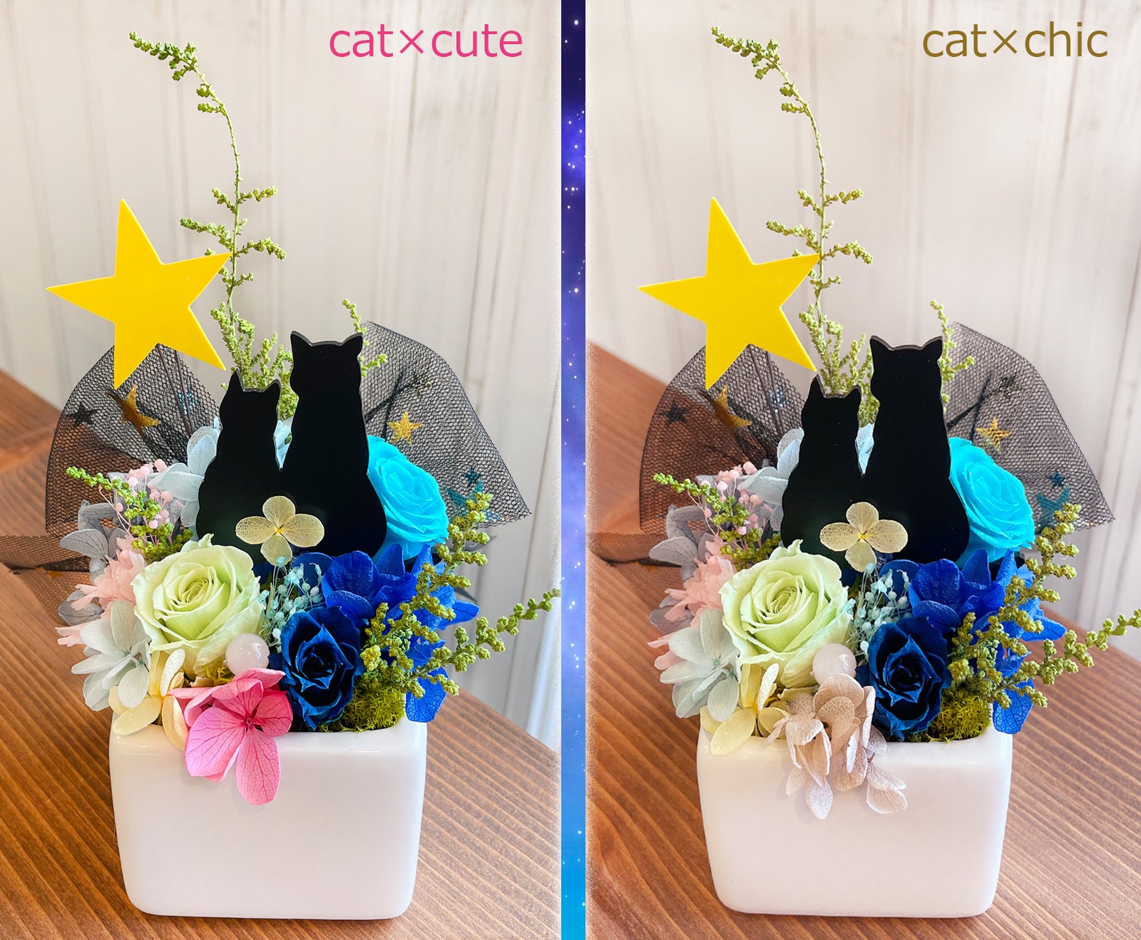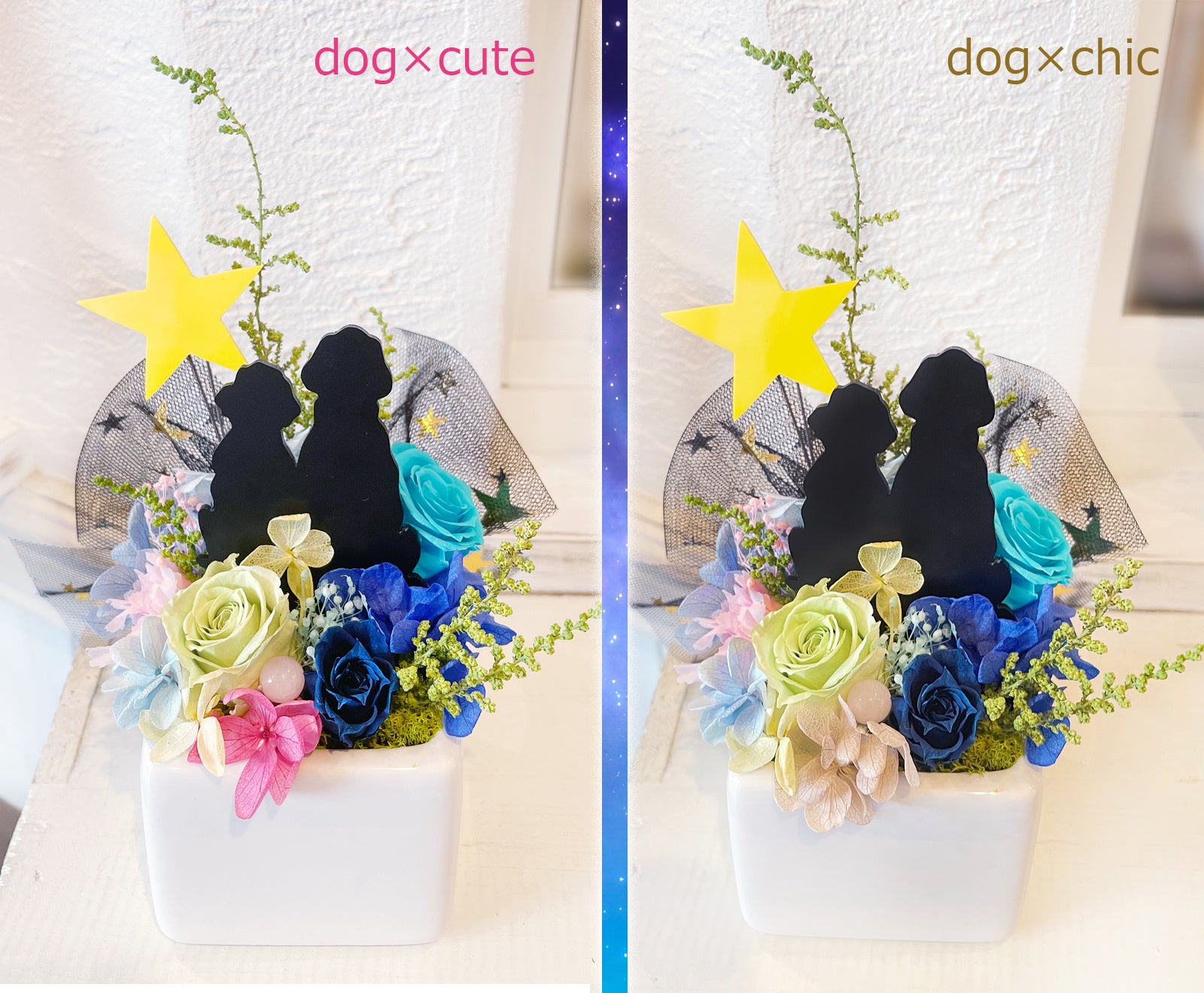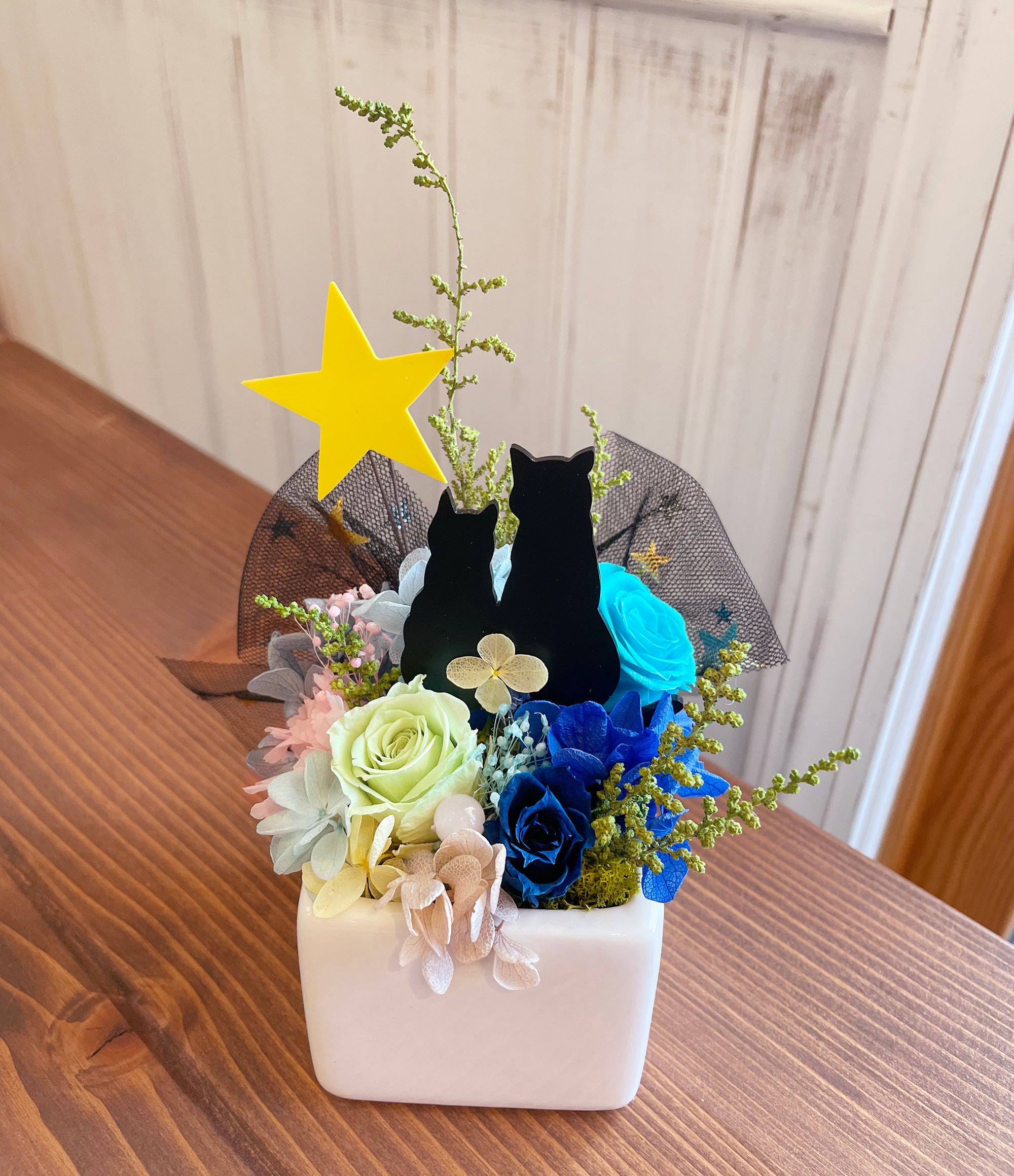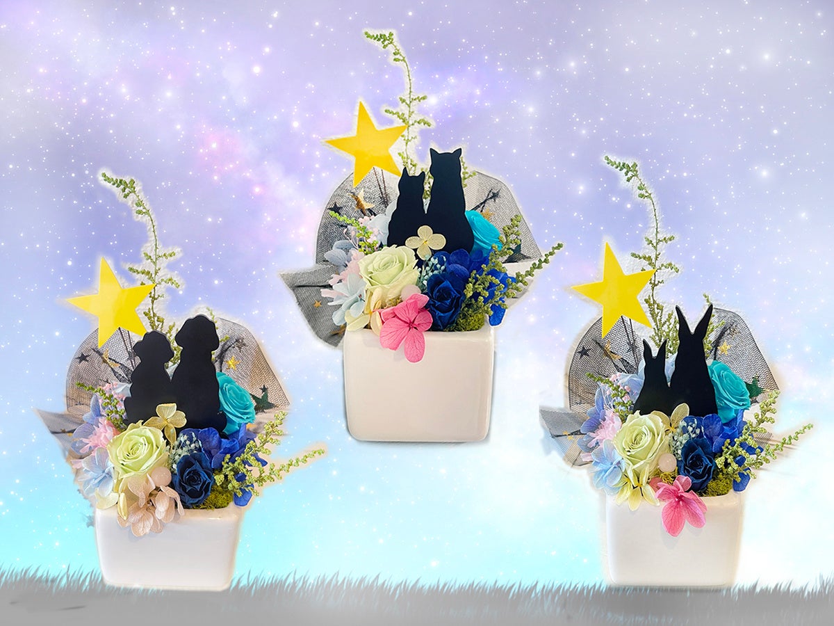 「愛するペットとずっと一緒にいたい・・!」そんな願いをお星さまに掛ける、よりそう2匹のどうぶつを叙情的に描写したフラワーアレンジメント「ずっと一緒」。