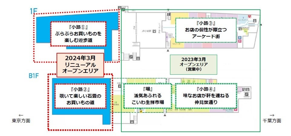 小岩らしい親しみある、賑やかなショッピングセンターを目指し、東京側エリアには新たに「ぶらぶらお買いものを楽しむ遊歩道」「覗いて楽しい石畳のお買いもの道」をテーマとする2つのゾーンが誕生し、シャポー⼩岩全館で街とつながる4つの個性をもった『⼩路』と1つの『場』が完成します。東西に約300メートル続く細長い館内の風景が変化していく様子をお楽しみください。