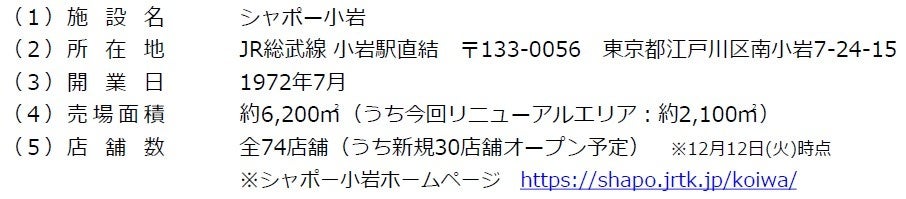 JR総武線にあるシャポー(小岩・市川・本八幡・船橋)は2012年より各館のリニューアルを順次実施してまいりました。今回のシャポー小岩のグランドオープンをもって、全リニューアルが完了いたします。これからも「人と街をむすぶ たのしい出会い ここちよい時間」を過ごしていただける場所を目指し、地域の皆さまとともに歩んでまいります。