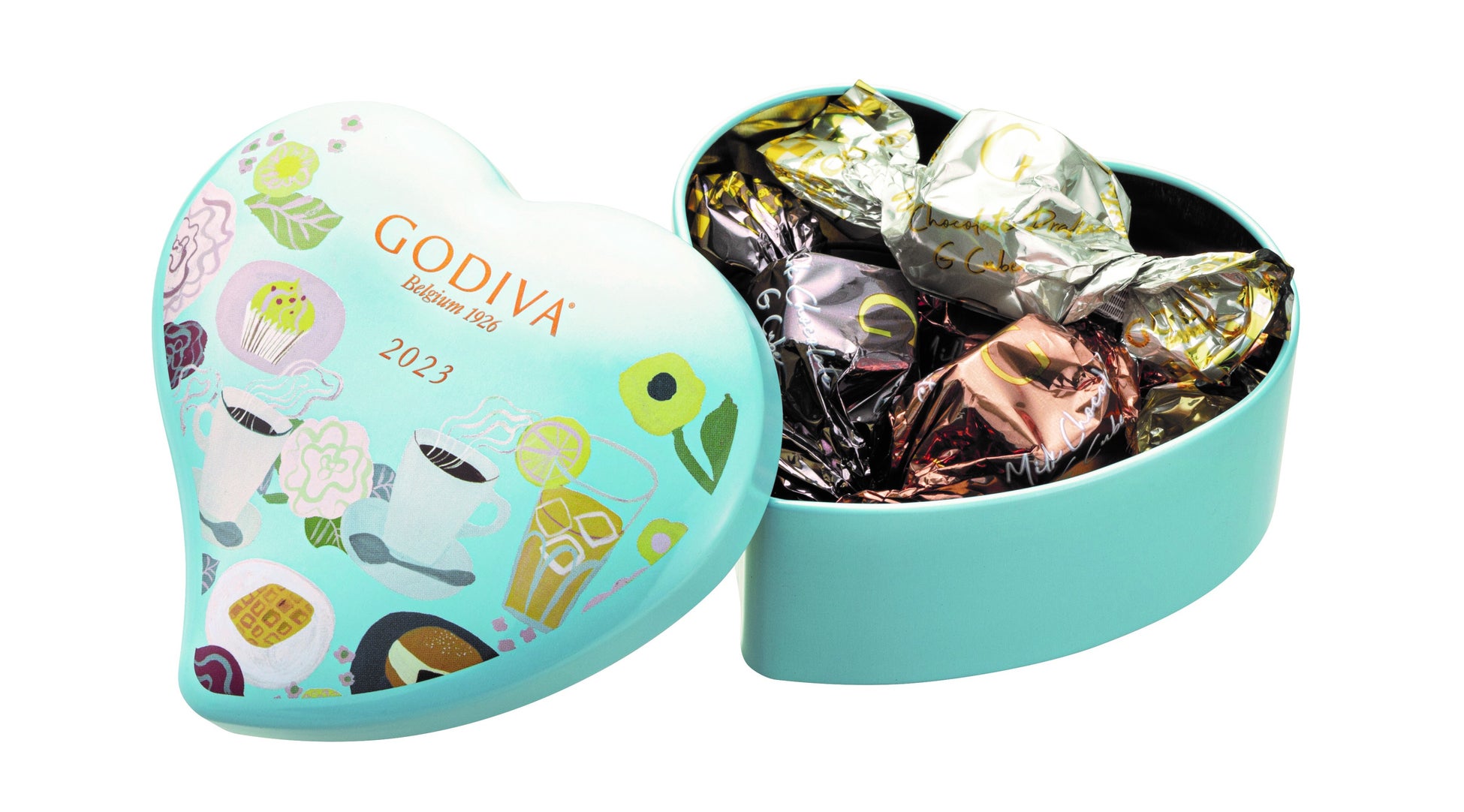 ティーカップ、フラワー、マリトッツォなど、カフェでの幸せな時間をイメージしたモチーフが描かれた鮮やかな水色のハート缶に、ホワイトチョコレートプラリネ、ブロンドソルテッドキャラメル、ミルクチョコレート、ダークチョコレートの4種類のG キューブ チョコレートを詰め合わせました。