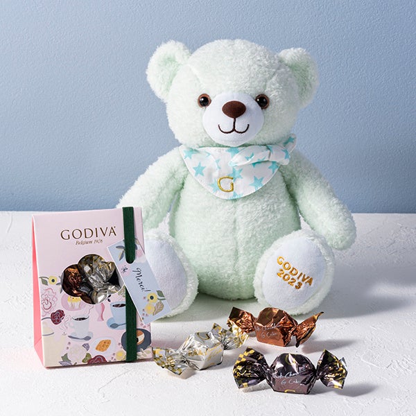 首元に結んである星柄のスカーフがキュートな、ミントグリーンのホワイトデー限定ベアです。ホワイトチョコレートプラリネ、ミルクチョコレート、ダークチョコレートの3種類のG キューブを詰め合わせたタグ付きのパッケージとセットにしました。ホワイトデーの贈り物におすすめです。
