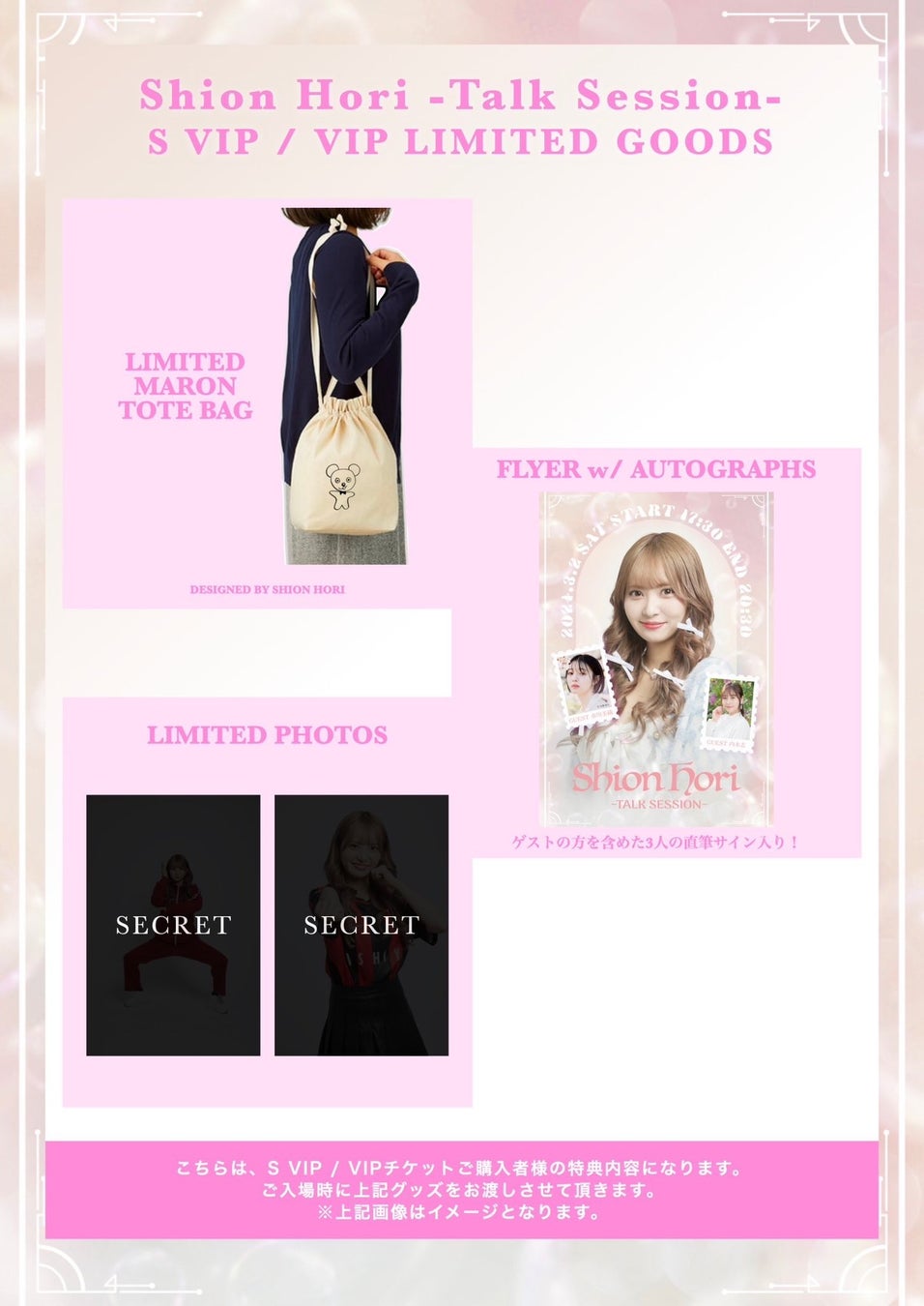 現在一般チケットのほか、堀さんとの2ショット撮影特典や限定グッズなどが付いた VIP チケットも販売中!この機会をお見逃しなく。