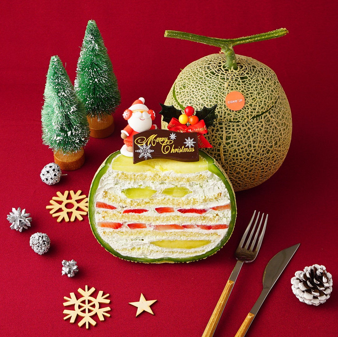 累計販売数3万個突破のメロン丸ごと一個を贅使用し、中身をくり抜いたメロンの中に自家製のふわふわスポンジケーキ、メロン風味の生クリーム、マスクメロンの果肉、苺がミルフィーユ状に丁寧に重なり合って詰め込まれています。クリスマス限定でかわいいサンタさんのオーナメントが付いています。カットした時のインパクトをお楽しみください。
