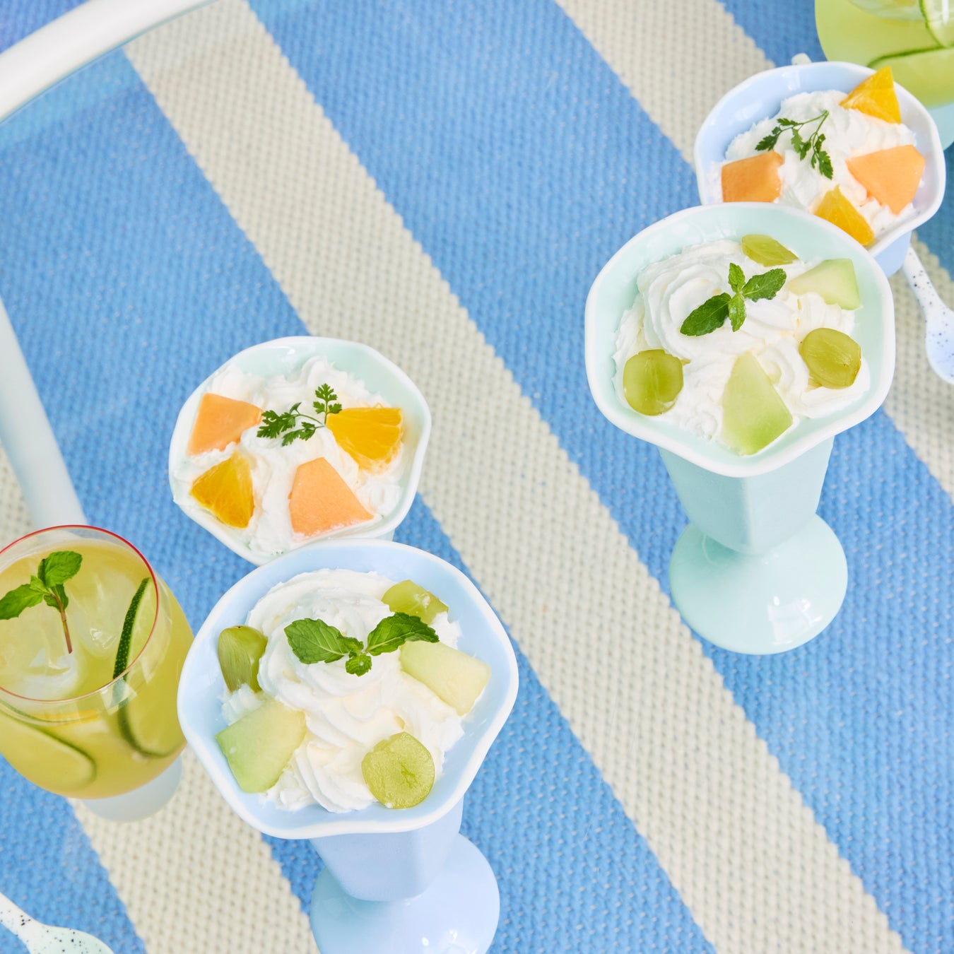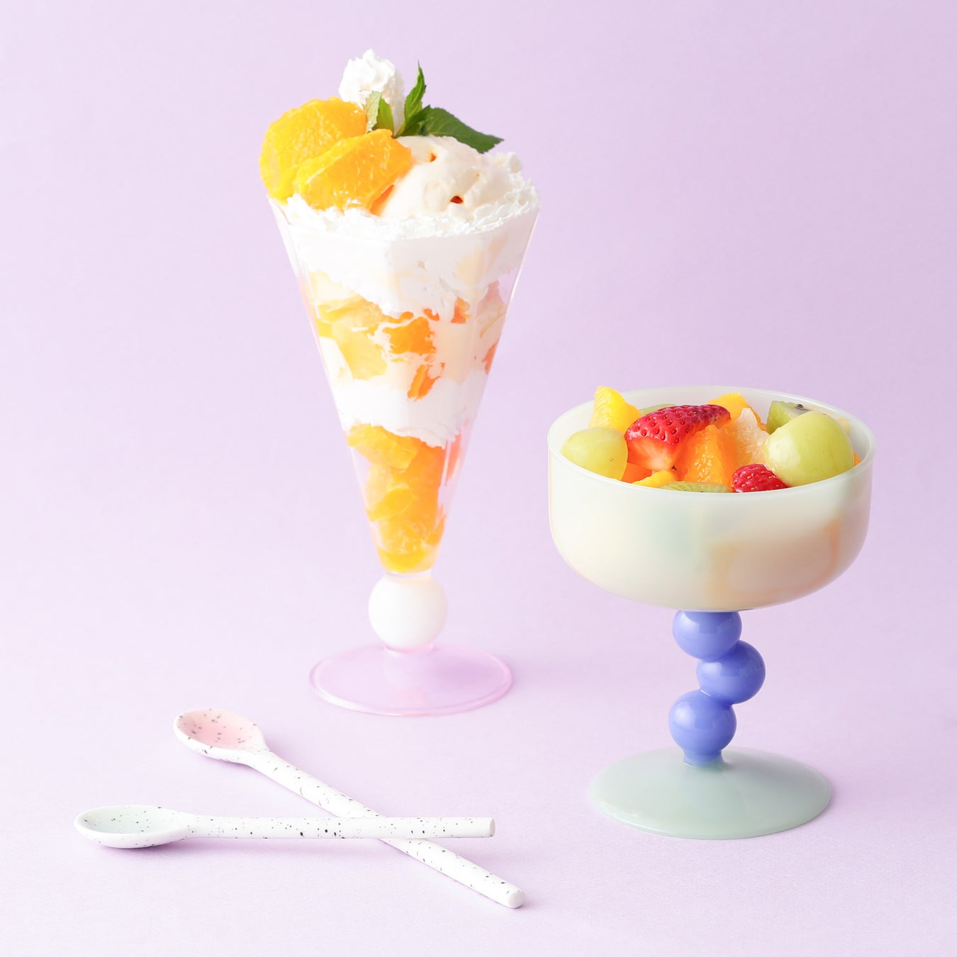 キャンディのような丸い玉がかわいいグラスです。炭酸飲料にフルーツやピューレを組み合わせると、より夏らしさを楽しめます。