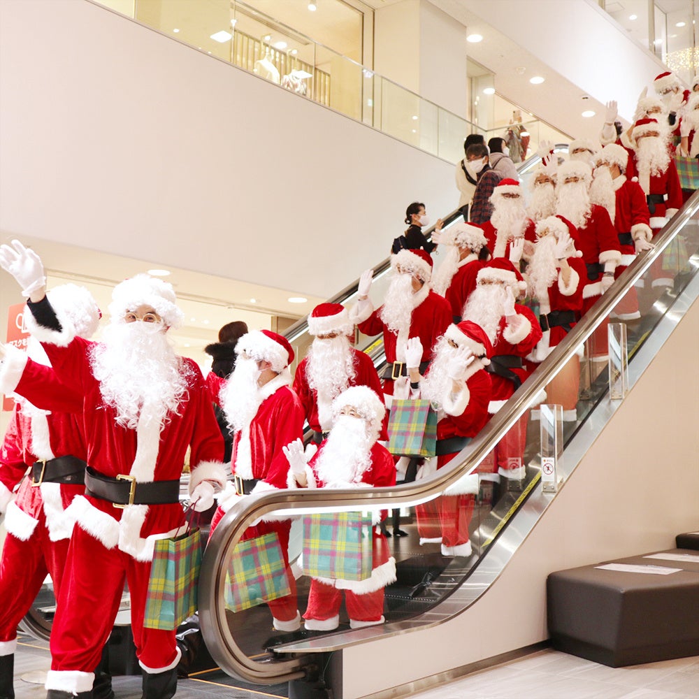 「サンタパレード」は、ジェイアール京都伊勢丹のクリスマスシーズンを象徴するイベントです。2階から11階まで一直線に続く全長約160メートルのエスカレータを、従業員が扮した20名のサンタクロースが一斉に下る姿で毎年多くのお客さまに親しまれています。2025年は、クリスマスキャンペーンビジュアル「ふしぎのふゆげしき」のストーリーをもとに、サンタクロースと江戸の世界を組み合わせた特別な演出で展開します。