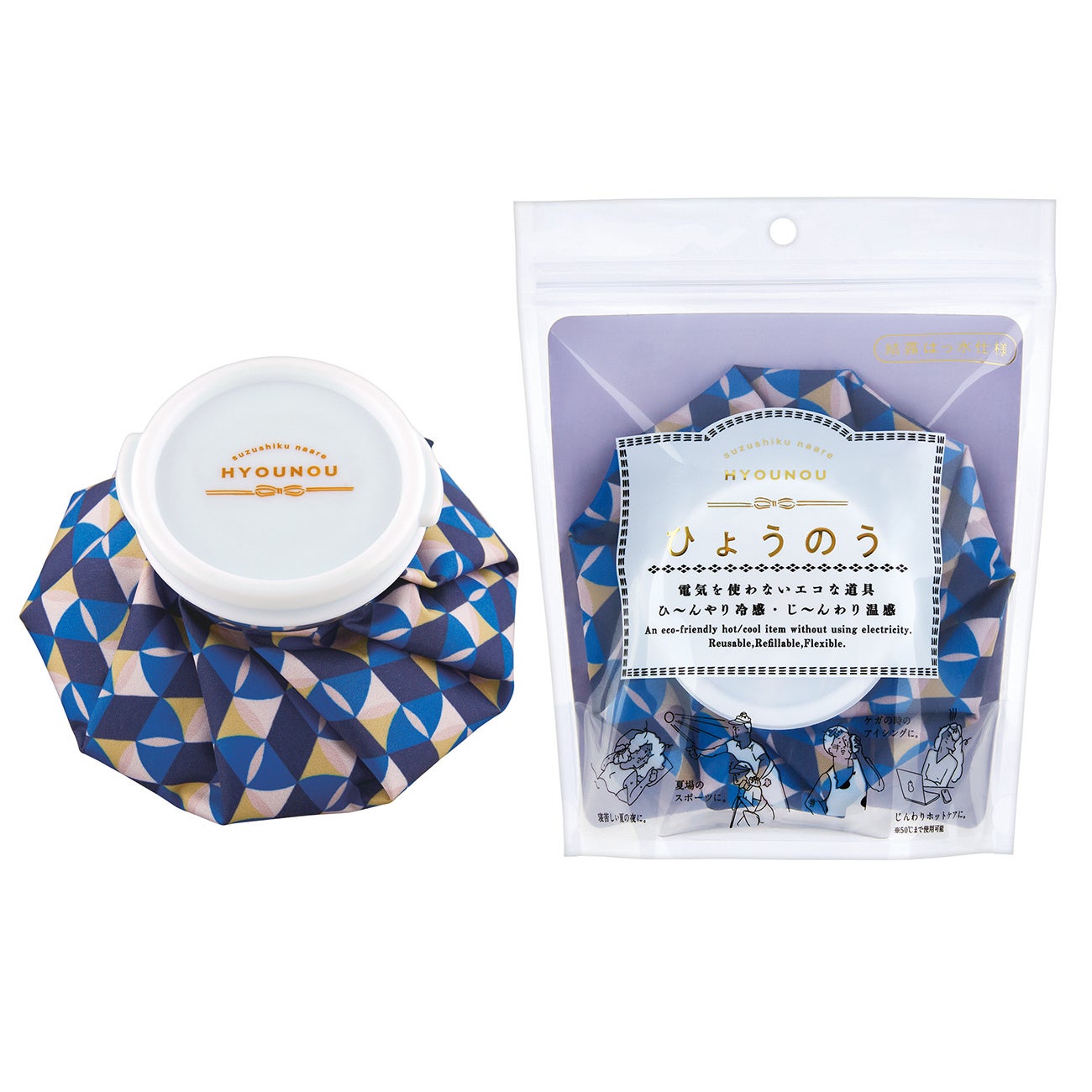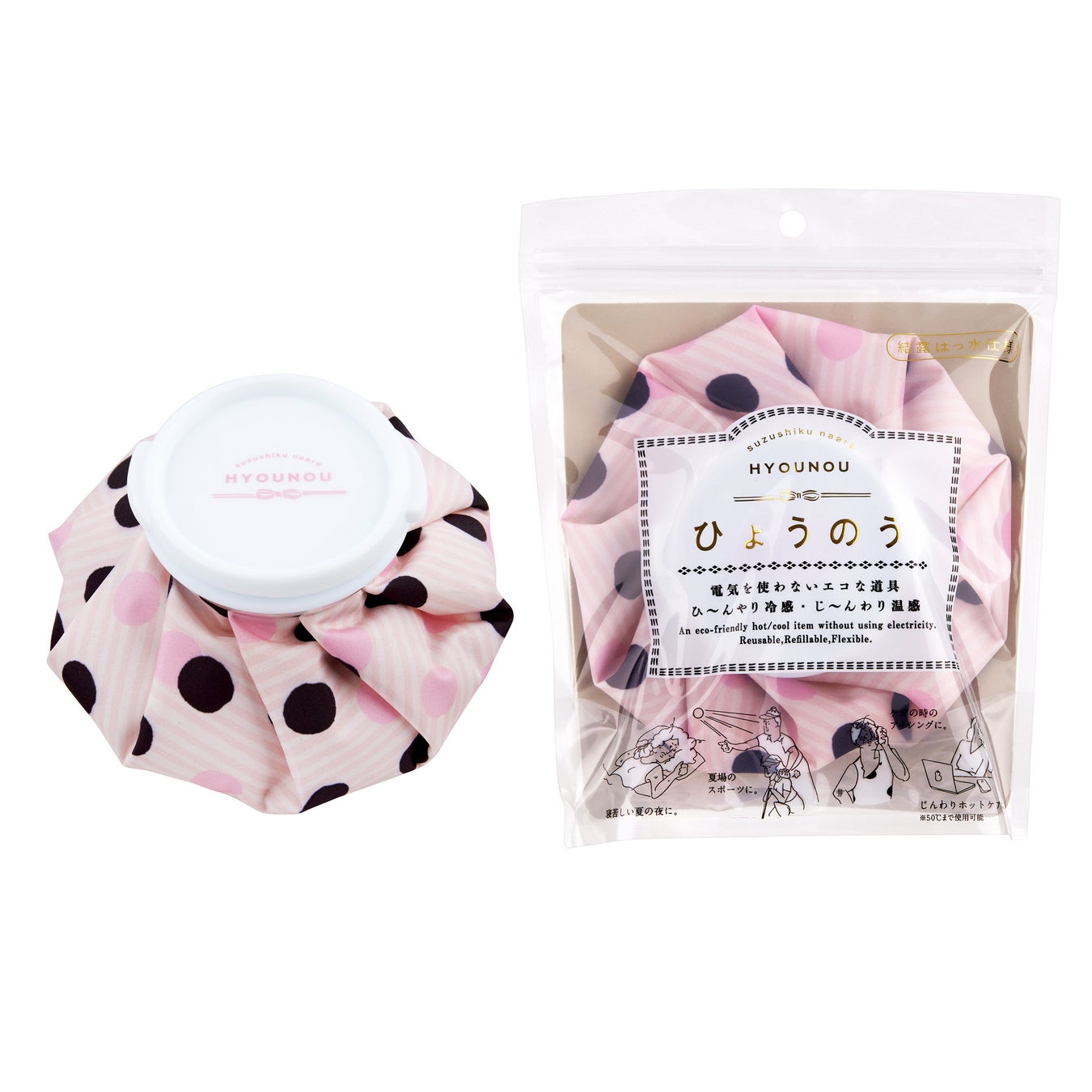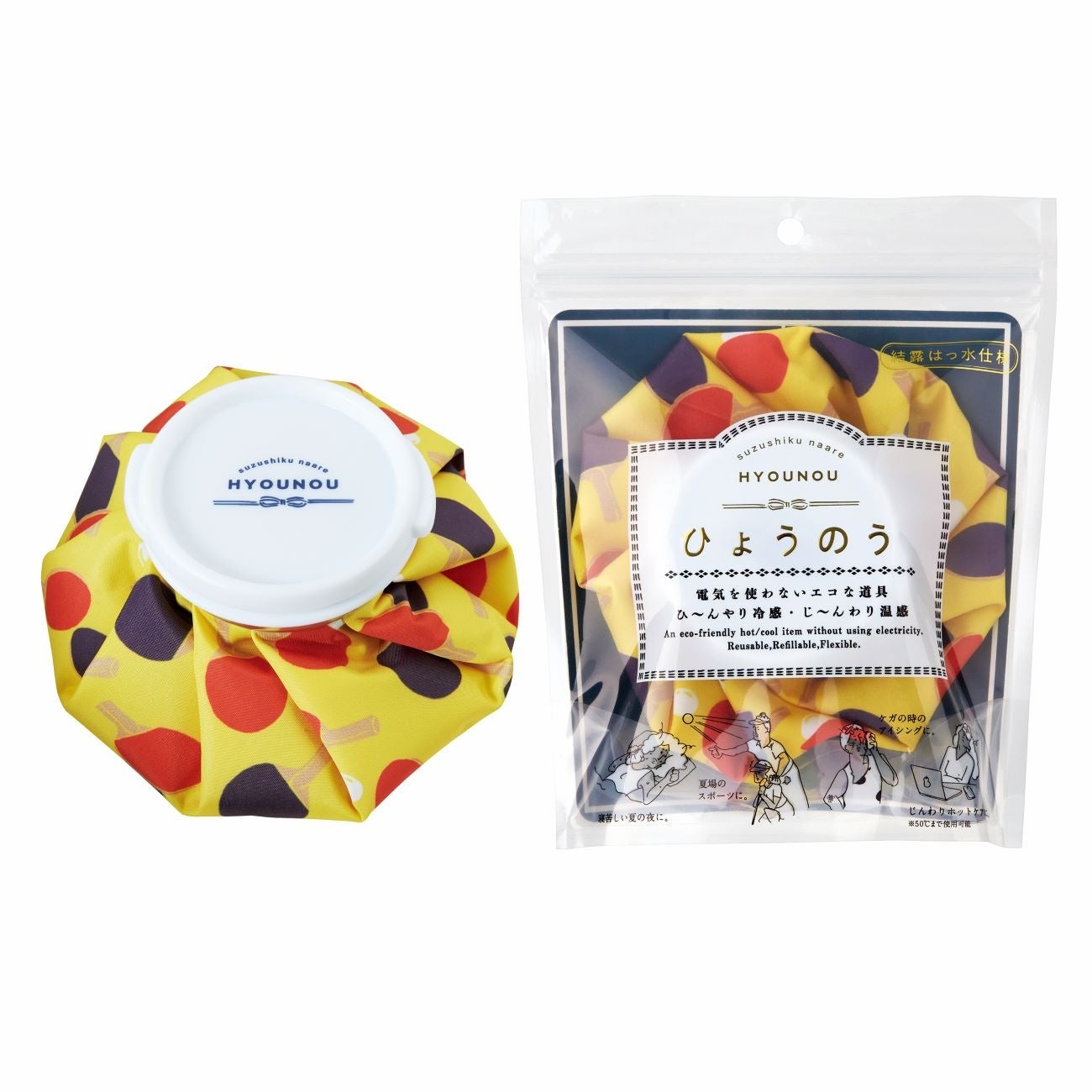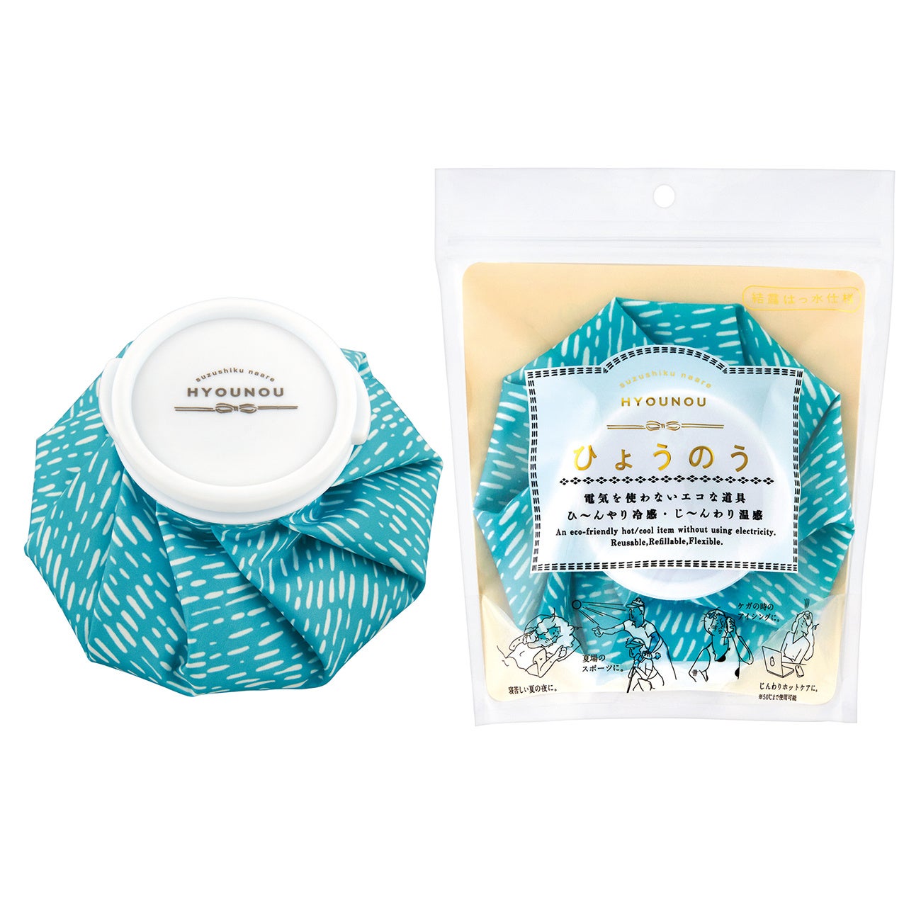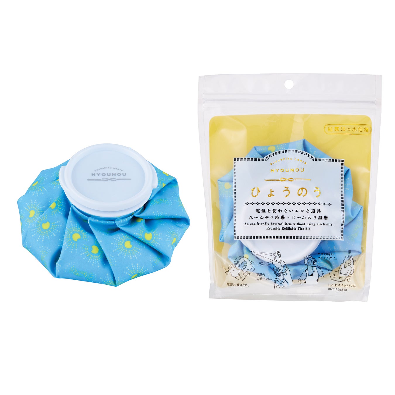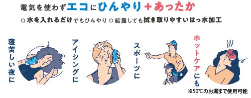 「涼しくなあれ ひょうのう」はくりかえし使えるエコなひんやりアイテムとして、また耐熱機能(50℃まで)も備わっているので、目や腰のホットケアにもご使用いただけます。