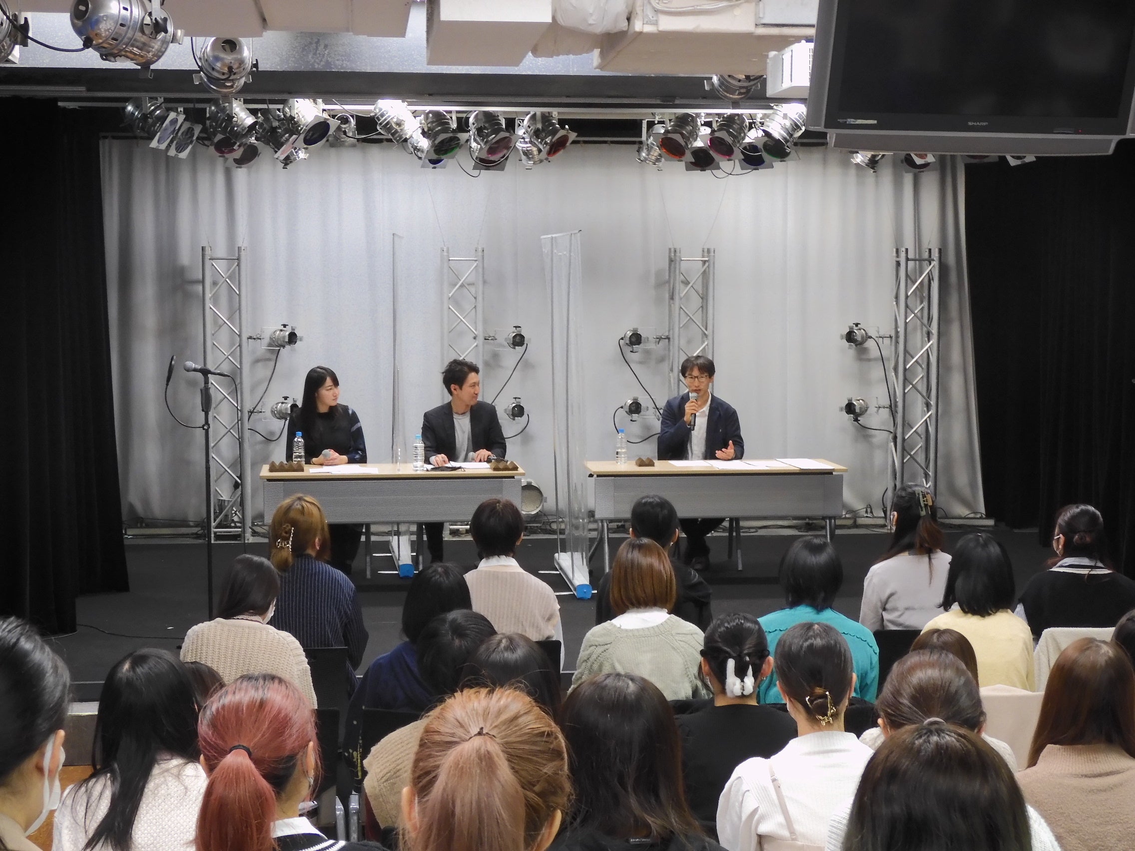 特別講義では、スマホゲーム「モンスターストライク」のサウンドディレクターを務め、台本制作もご担当されている桑原理一郎さん、AMGの卒業生声優であり本作のキャラクターボイスを数多く担当されている宮負潤さん(パワー・ライズ所属)と秋山絵理さん(ケンユウオフィス所属)のお三方にご来校いただきました。
